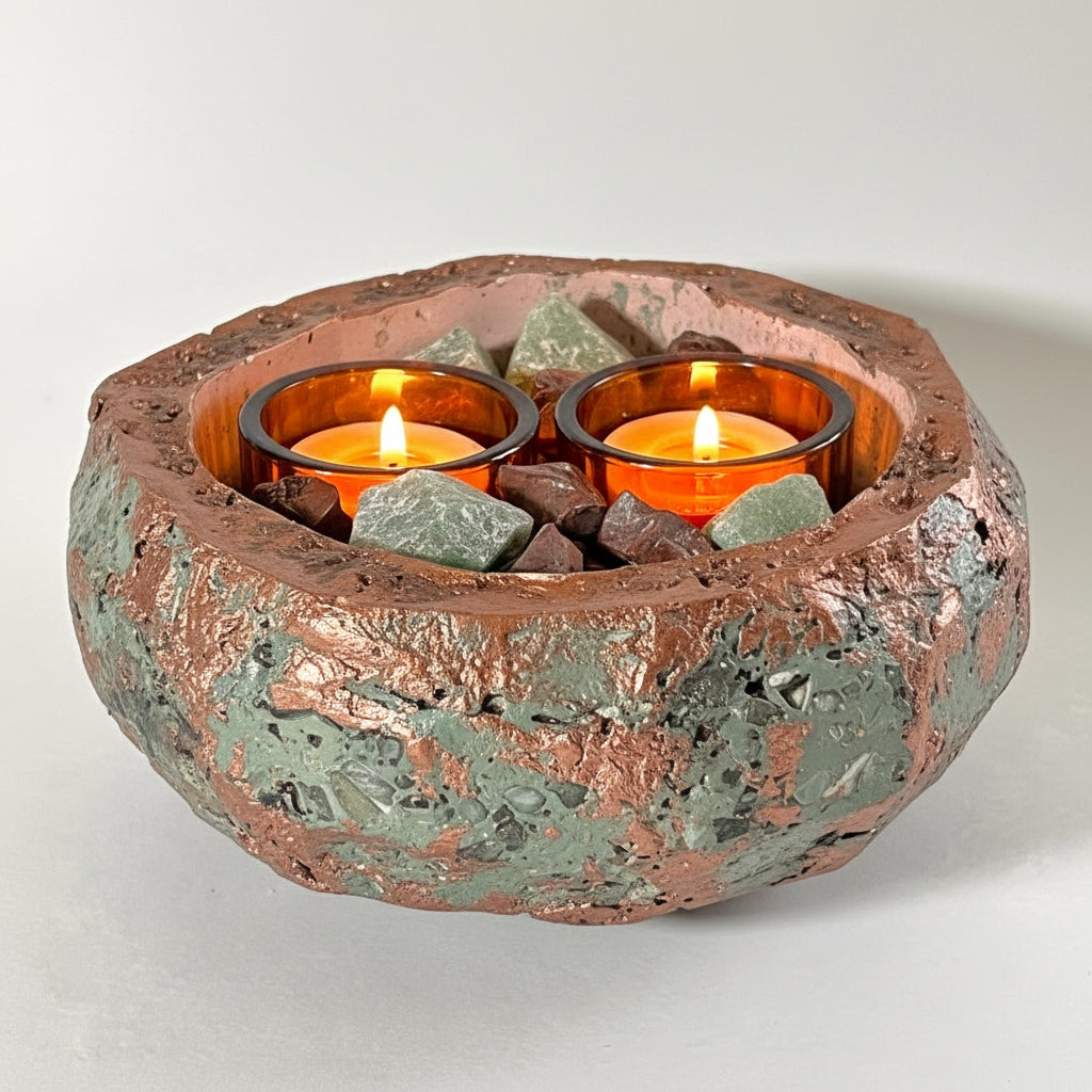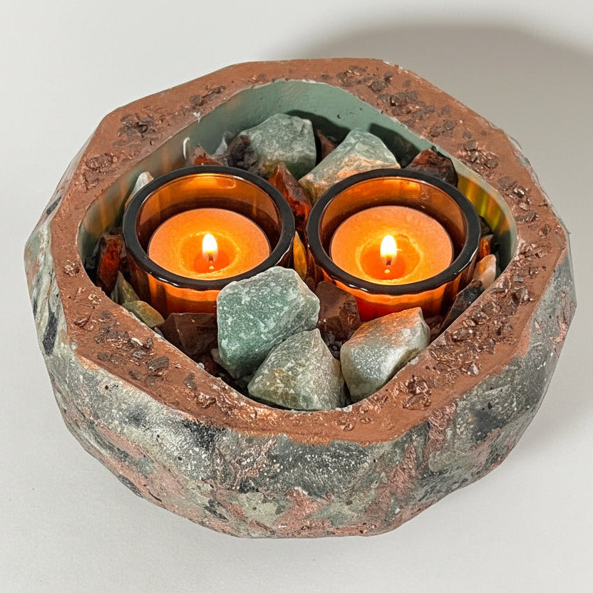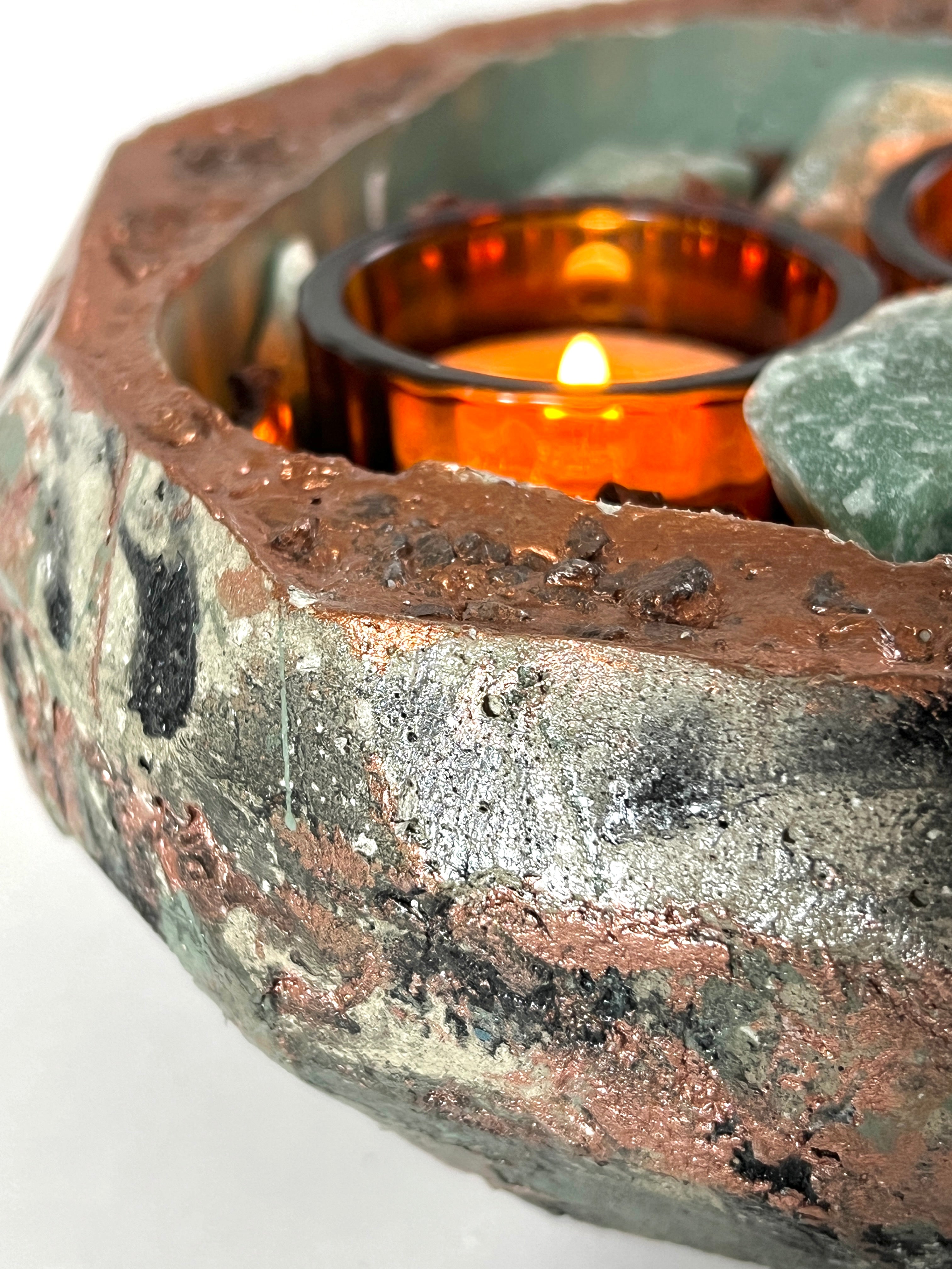Handmade concrete crystal candle centerpiece featuring Green Aventurine and Mahogany Obsidian. A unique gemstone tealight holder for décor or gifts.