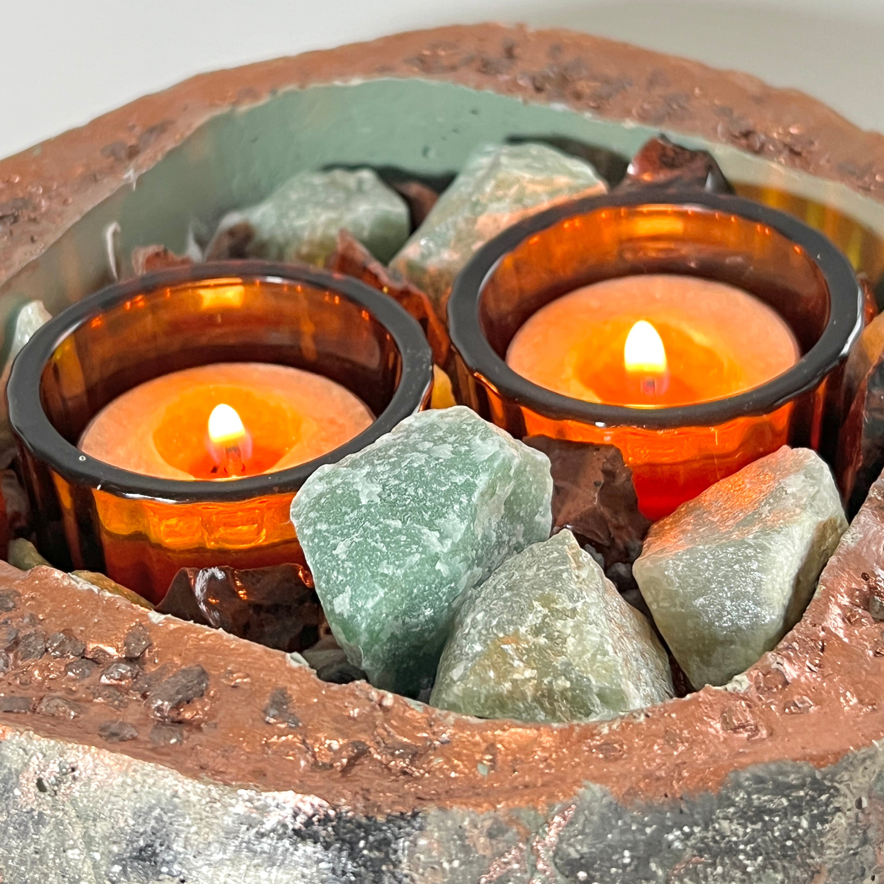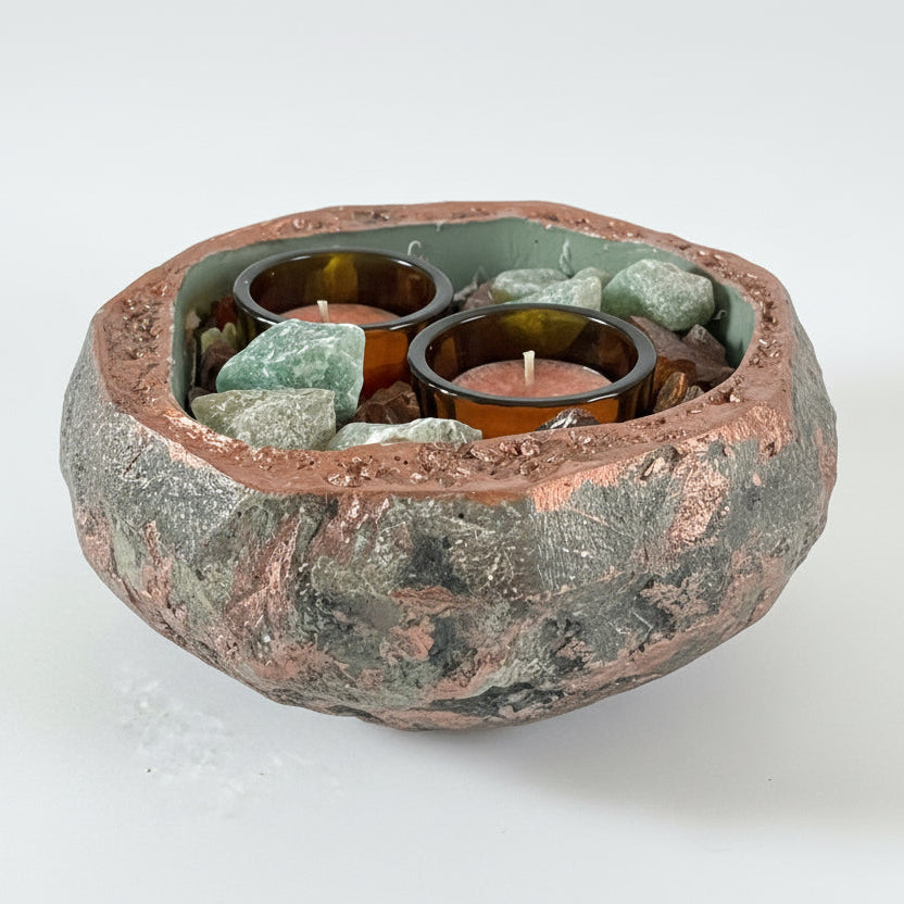The organic tones of green stone and warm earth hues create a calming presence, while the soft glow of the tealights enhances the natural textures of the crystals. Whether placed on a coffee table, altar, or dining space, CAISA becomes a serene focal point that blends artisan design with elemental beauty.