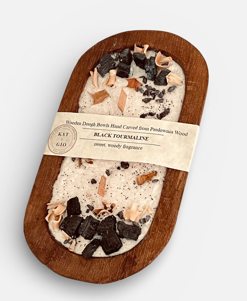 This handcrafted dough bowl candle arrangement features grounding black tourmaline, thoughtfully placed to create a sense of protection and balance. Set in a natural Paulownia wood dough bowl, the soft glow of the candle highlights the raw beauty of the crystals and subtle botanical accents.
