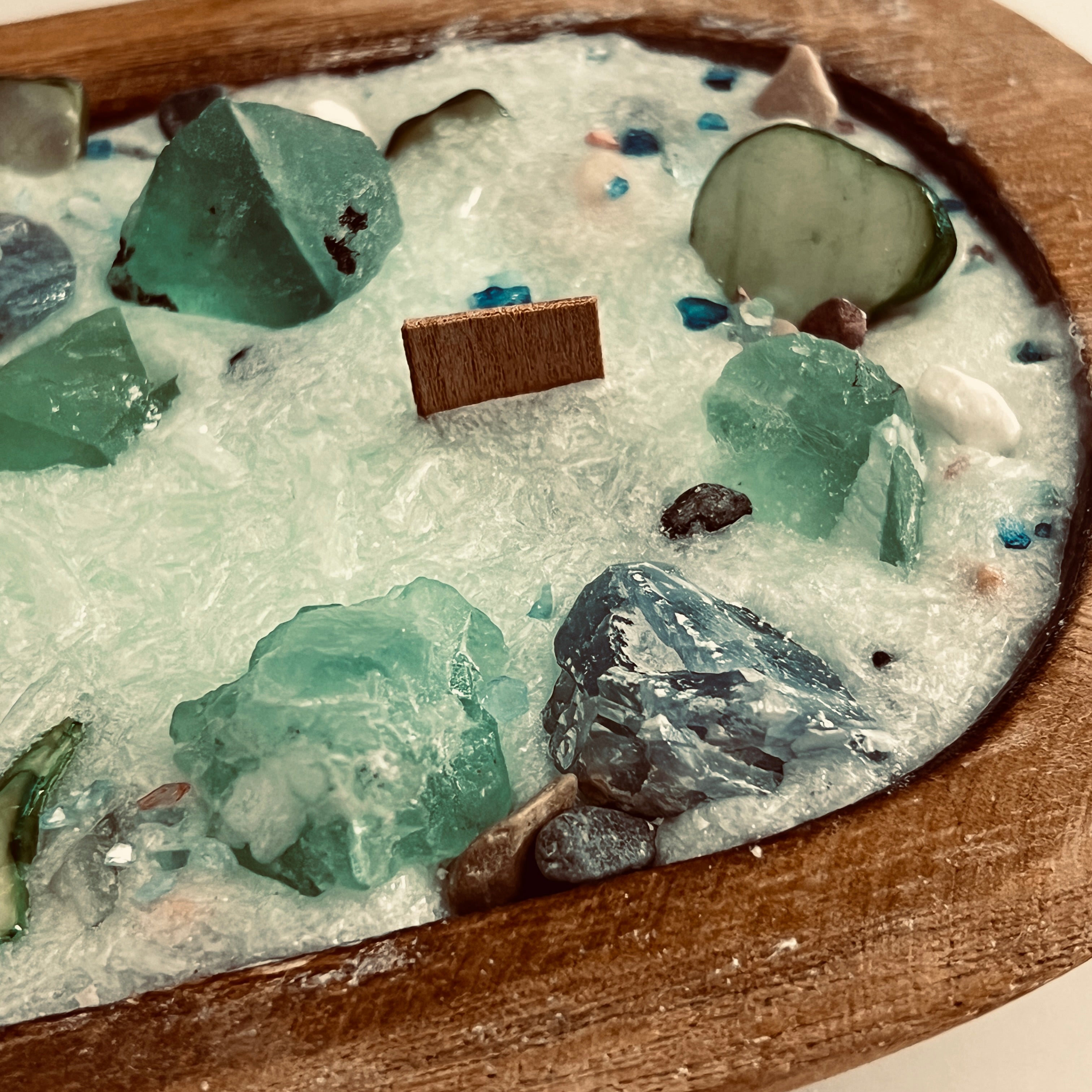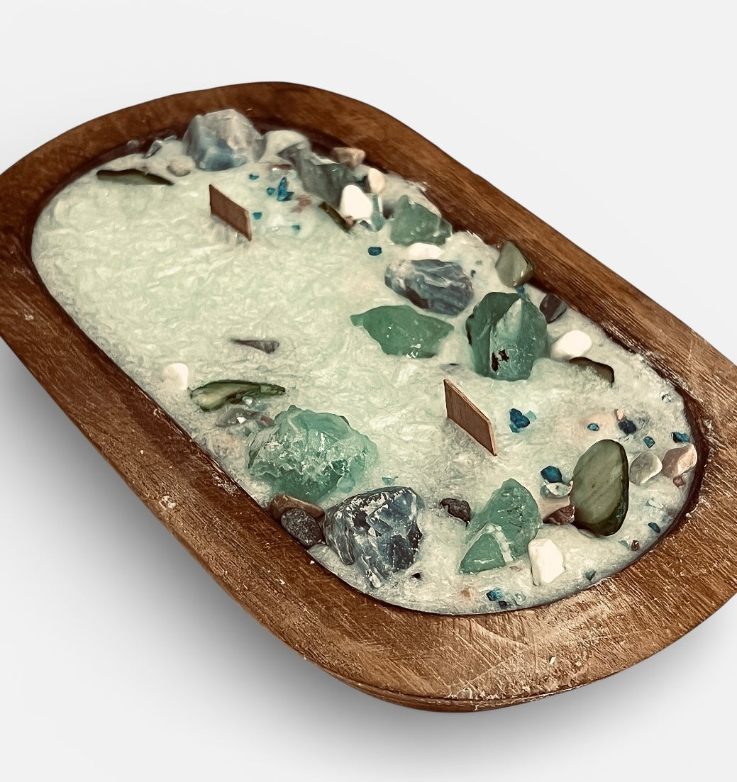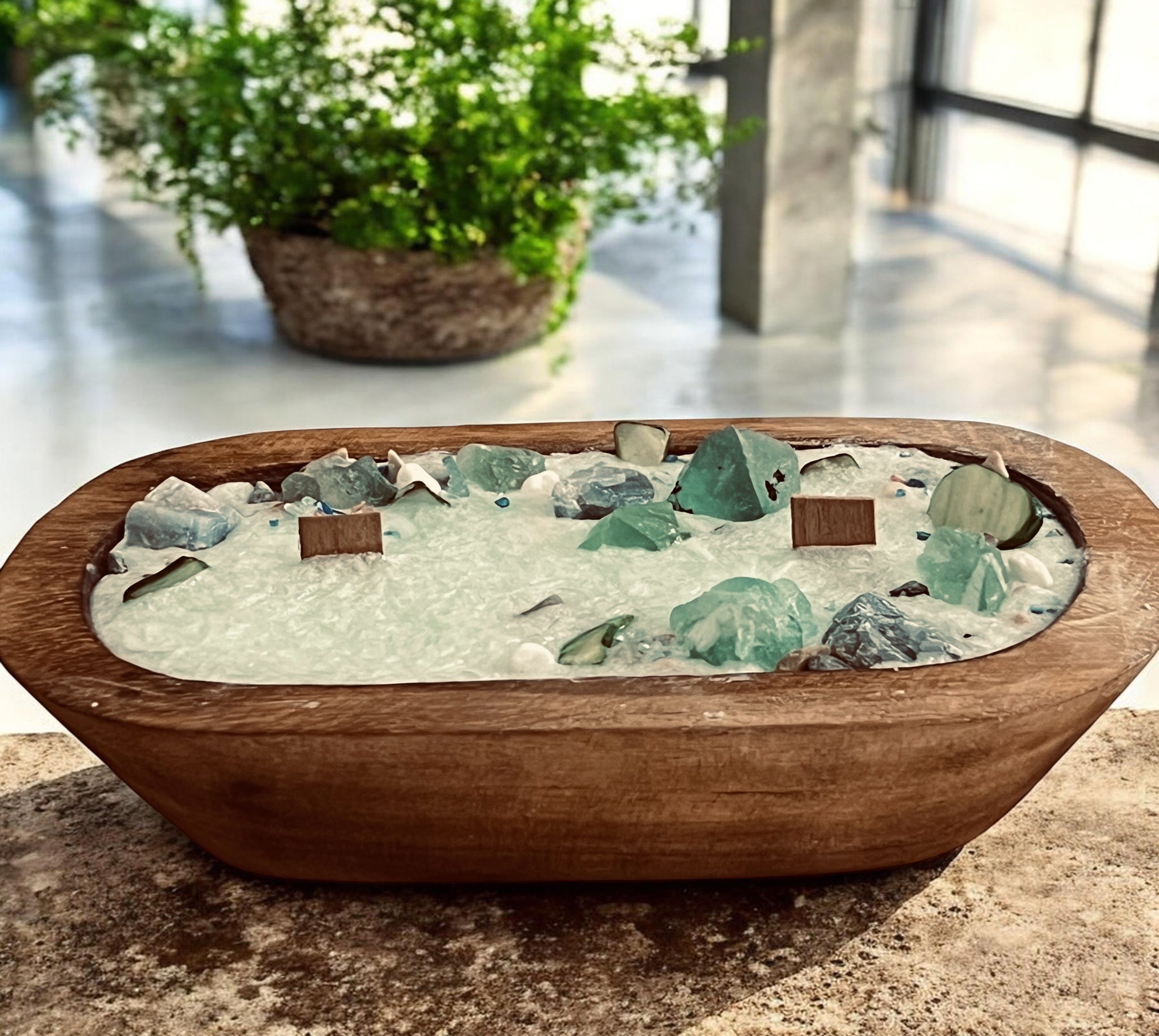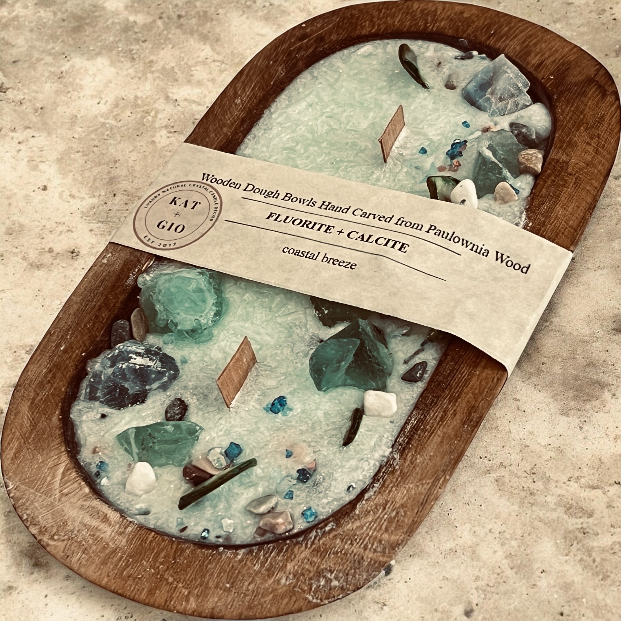 Set in a solid Paulownia wood dough bowl, the ocean-inspired hues of blue calcite and fluorite create a serene, coastal aesthetic that brings a sense of calm and clarity to any space. Each piece is one of a kind, thoughtfully designed to reflect the gentle rhythm of water, light, and nature.