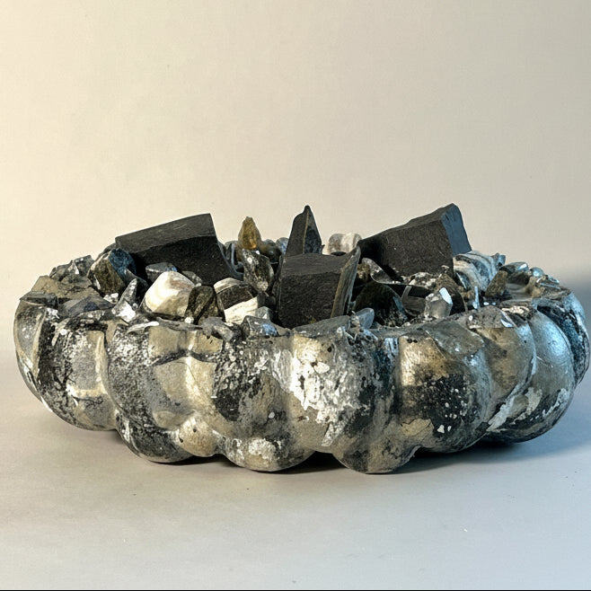 DIVINA is a handcrafted Luminesa crystal candlescape designed to bring grounded strength and mystical energy into your space. Sculpted by hand from raw concrete and adorned with genuine zebra onyx, basalt, and labradorite, this piece carries a striking palette of black and white stripes, volcanic black, and iridescent flashes of blue and gold.