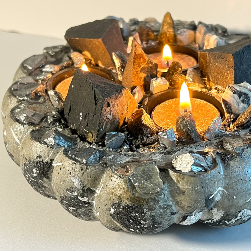 The dramatic combination of these powerful stones creates a captivating presence, while the soft glow of the tealights enhances the natural patterns of zebra onyx and the subtle shimmer of labradorite. Whether placed on a meditation altar, coffee table, or bedroom sanctuary, DIVINA becomes a bold focal point that blends artisan craftsmanship with elemental power.
