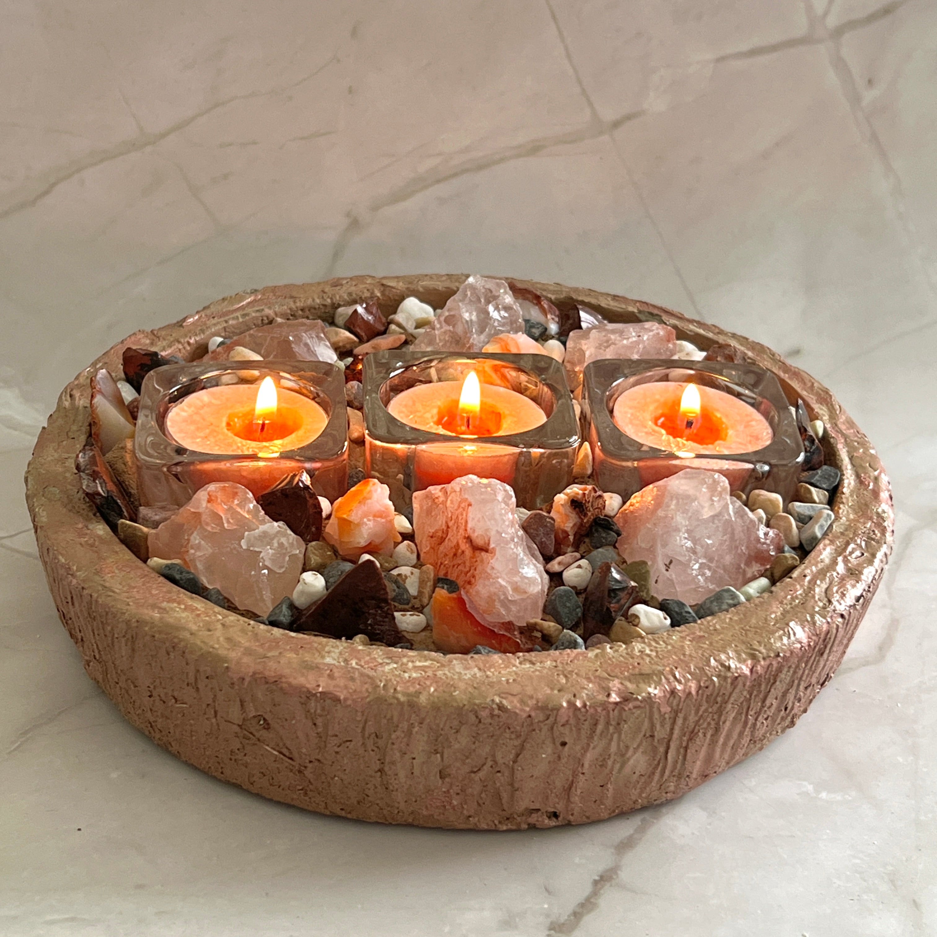 The vibrant energy of these powerful stones creates a captivating presence, while the soft glow of the tealights enhances the natural warmth and inner fire of each crystal. Whether placed on a dining table, creative workspace, or meditation altar, ECLISSE becomes a bold focal point that blends artisan craftsmanship with elemental passion.