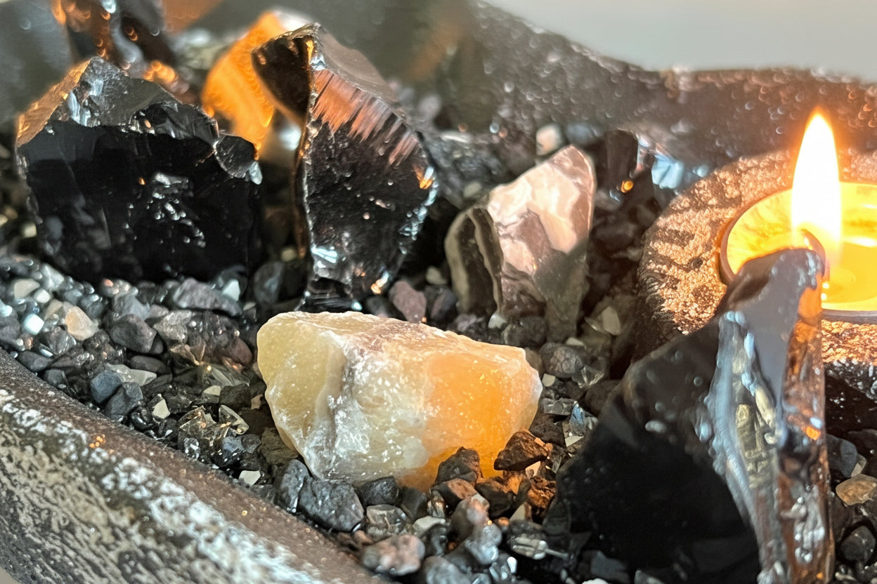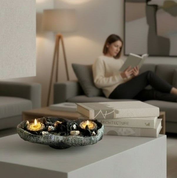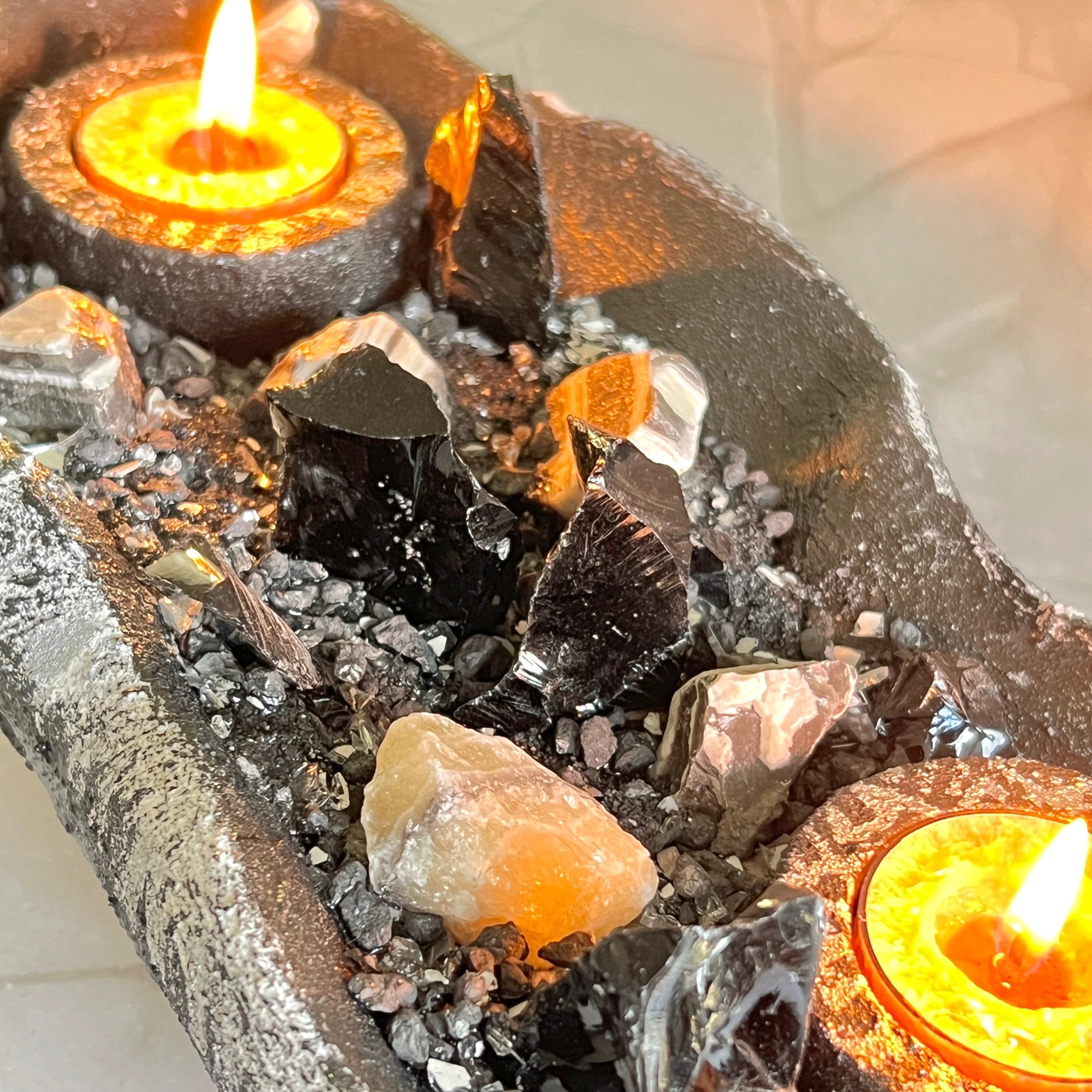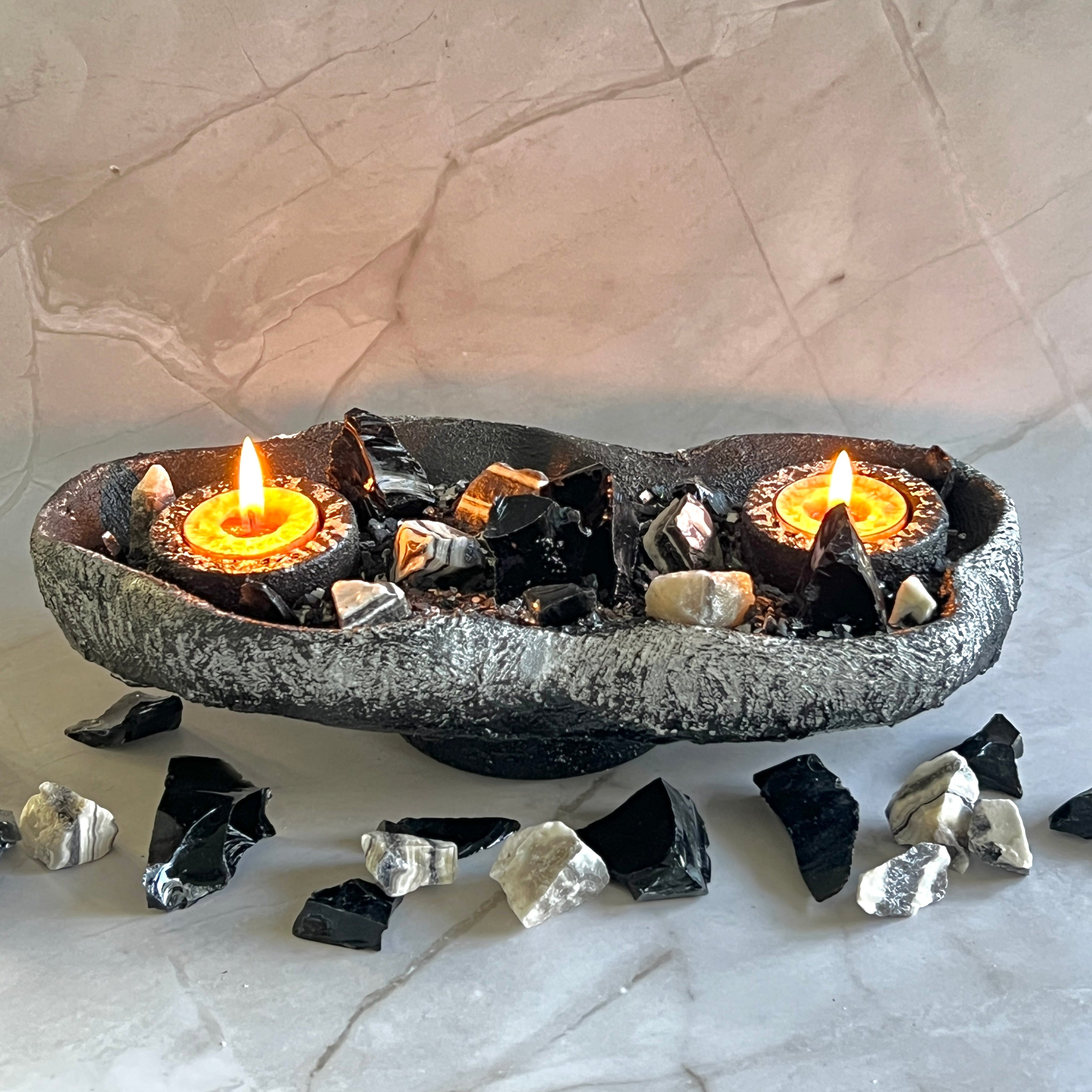 The dramatic combination of these powerful stones creates a commanding presence, while the soft glow of the tealights enhances the smooth depth of obsidian and the unique banding of zebra onyx. Whether placed on a meditation altar, coffee table, or bedroom sanctuary, FIAMA becomes a bold focal point that blends artisan craftsmanship with elemental power.