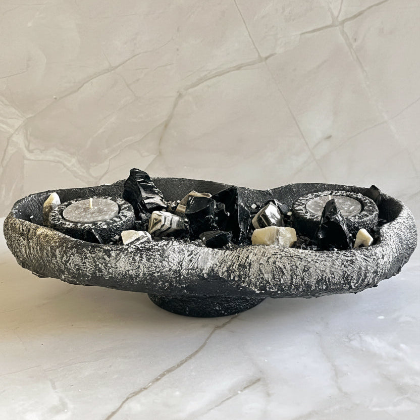 FIAMA is a handcrafted Luminesa crystal candlescape designed to bring protective energy and balanced strength into your space. Sculpted by hand from raw concrete and adorned with genuine black obsidian and zebra onyx, this piece carries a striking palette of deep volcanic black and distinctive black-and-white striped patterns.