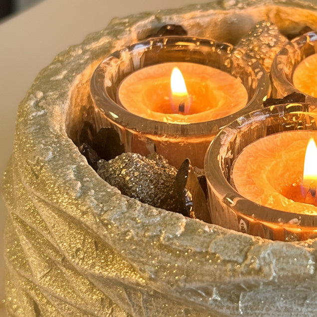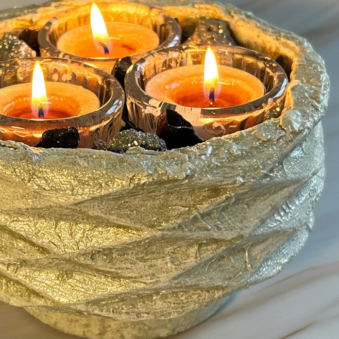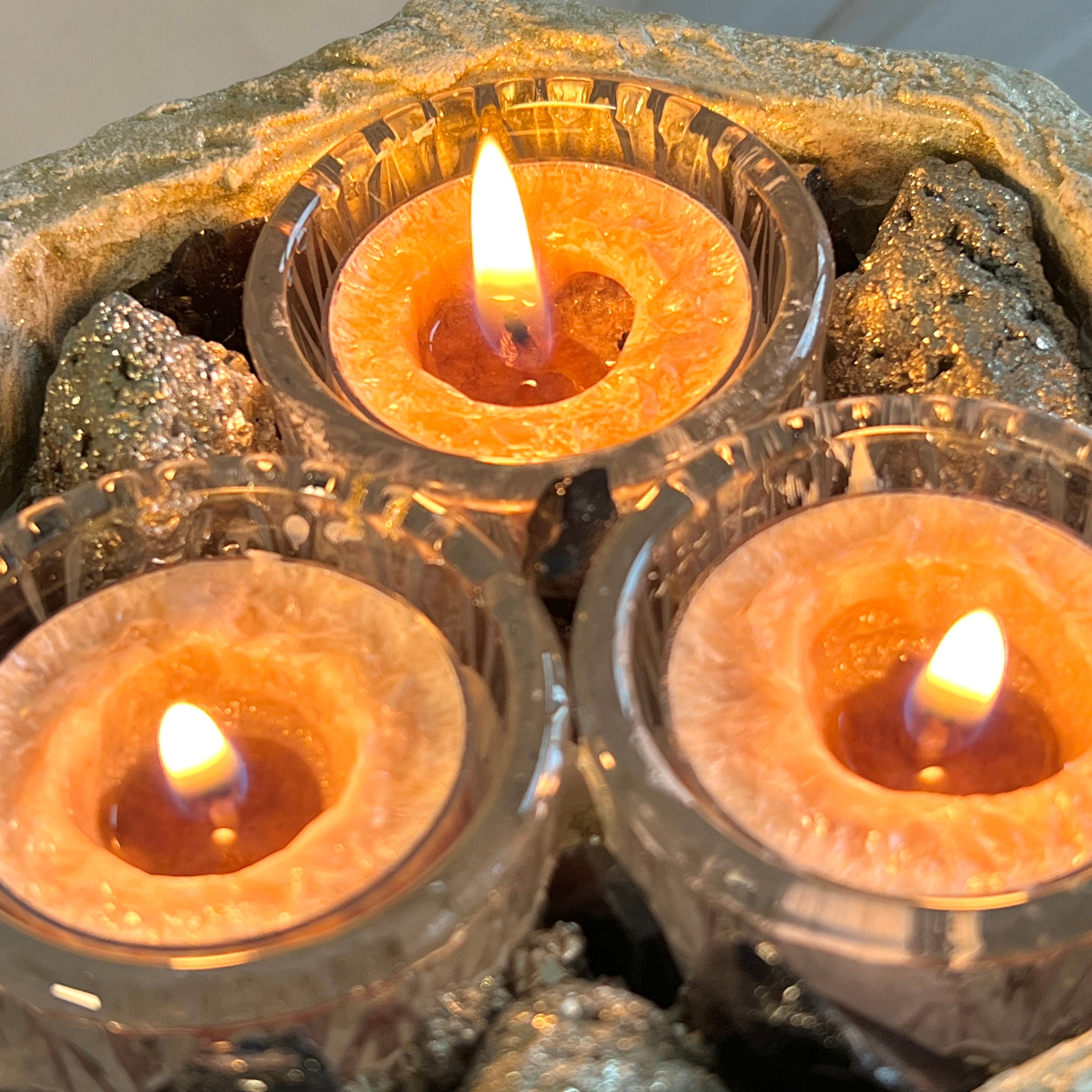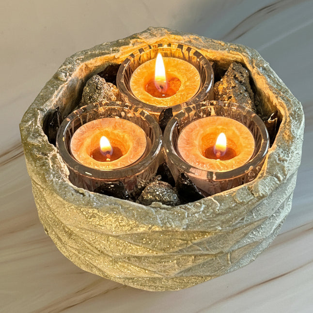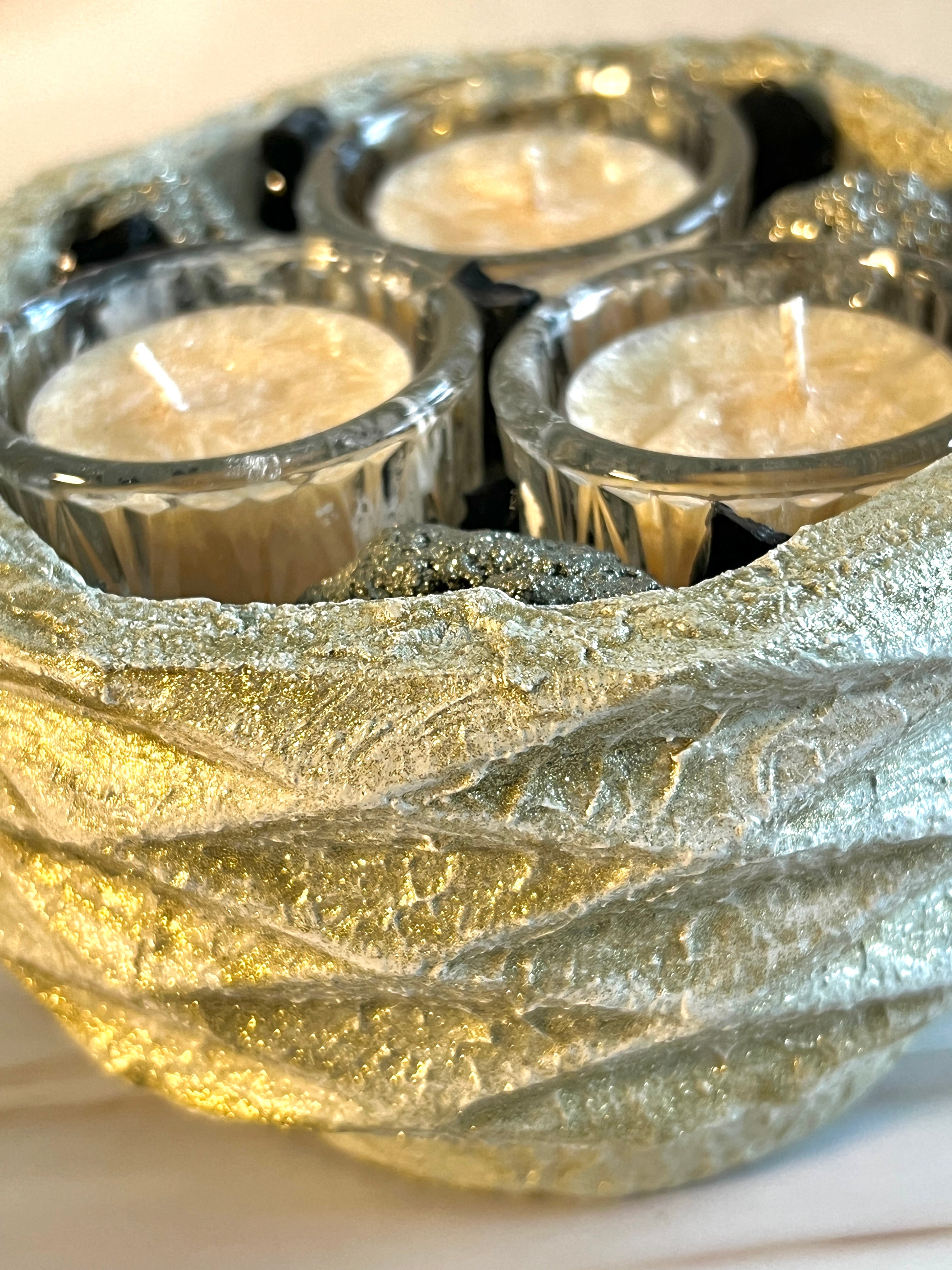 The dramatic contrast of these powerful stones creates a commanding presence, while the soft glow of the tealights enhances the natural metallic luster of pyrite and the smooth depth of obsidian. Whether placed on a desk, meditation altar, or living room centerpiece, LUMINA becomes a bold focal point that blends artisan craftsmanship with elemental power.