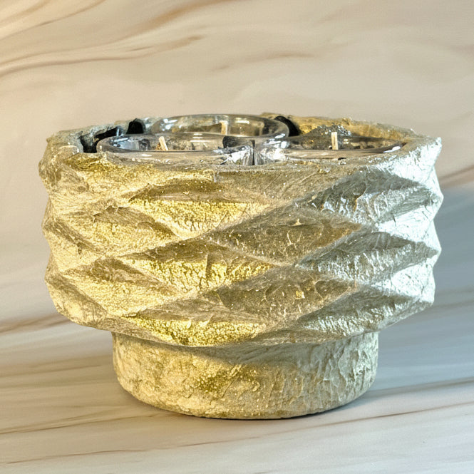 LUMINA is a handcrafted Luminesa crystal candlescape designed to bring abundance energy and protective strength into your space. Sculpted by hand from raw concrete and adorned with genuine pyrite and black obsidian, this piece carries a striking palette of metallic gold shimmer and deep volcanic black.