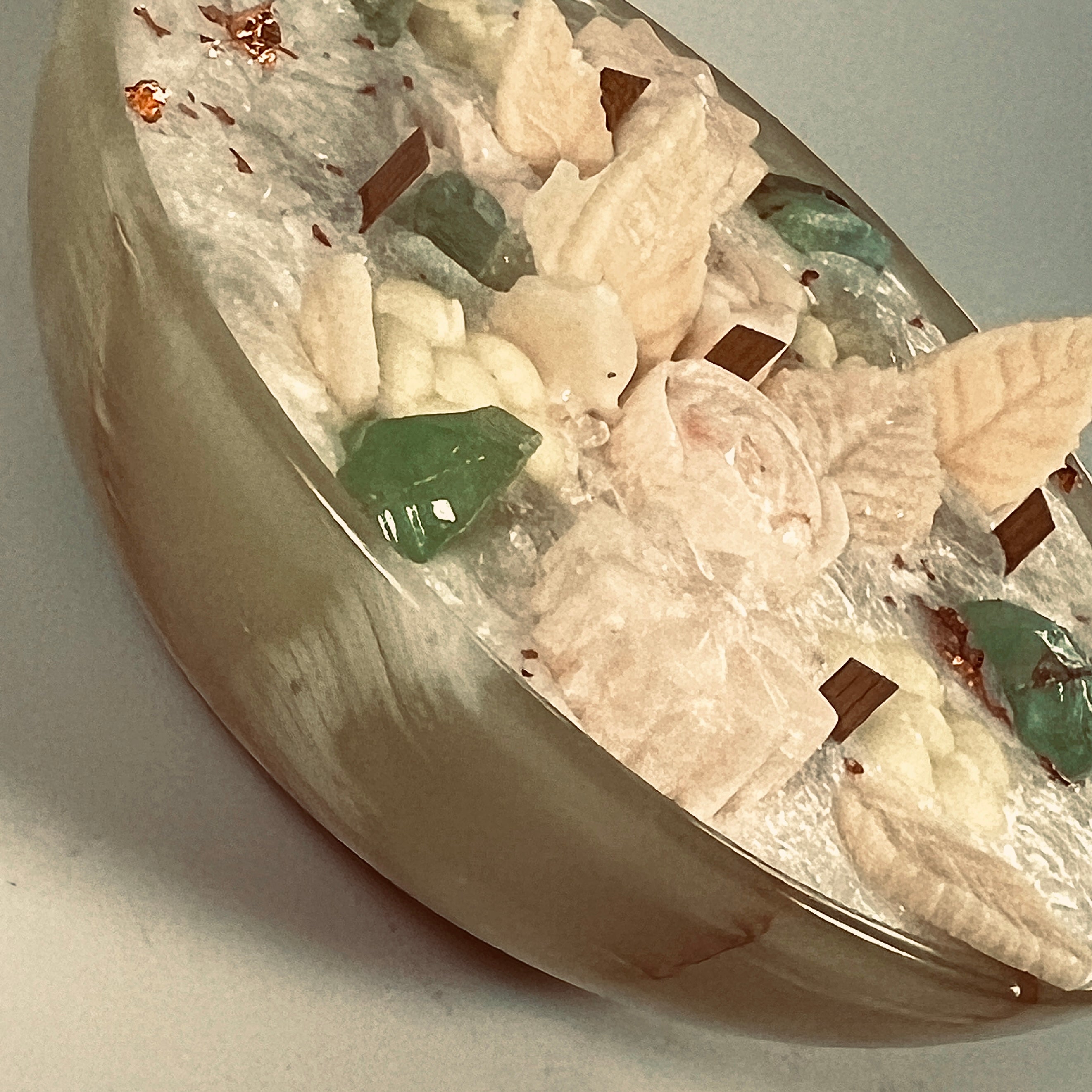 A bed of textured palm wax forms the base, accented with hand-poured wax florals, wooden wicks, and genuine Green Calcite crystals. Their soft, translucent green tones add a refreshing, luminous quality to the composition, evoking the calm of a sunlit meadow.