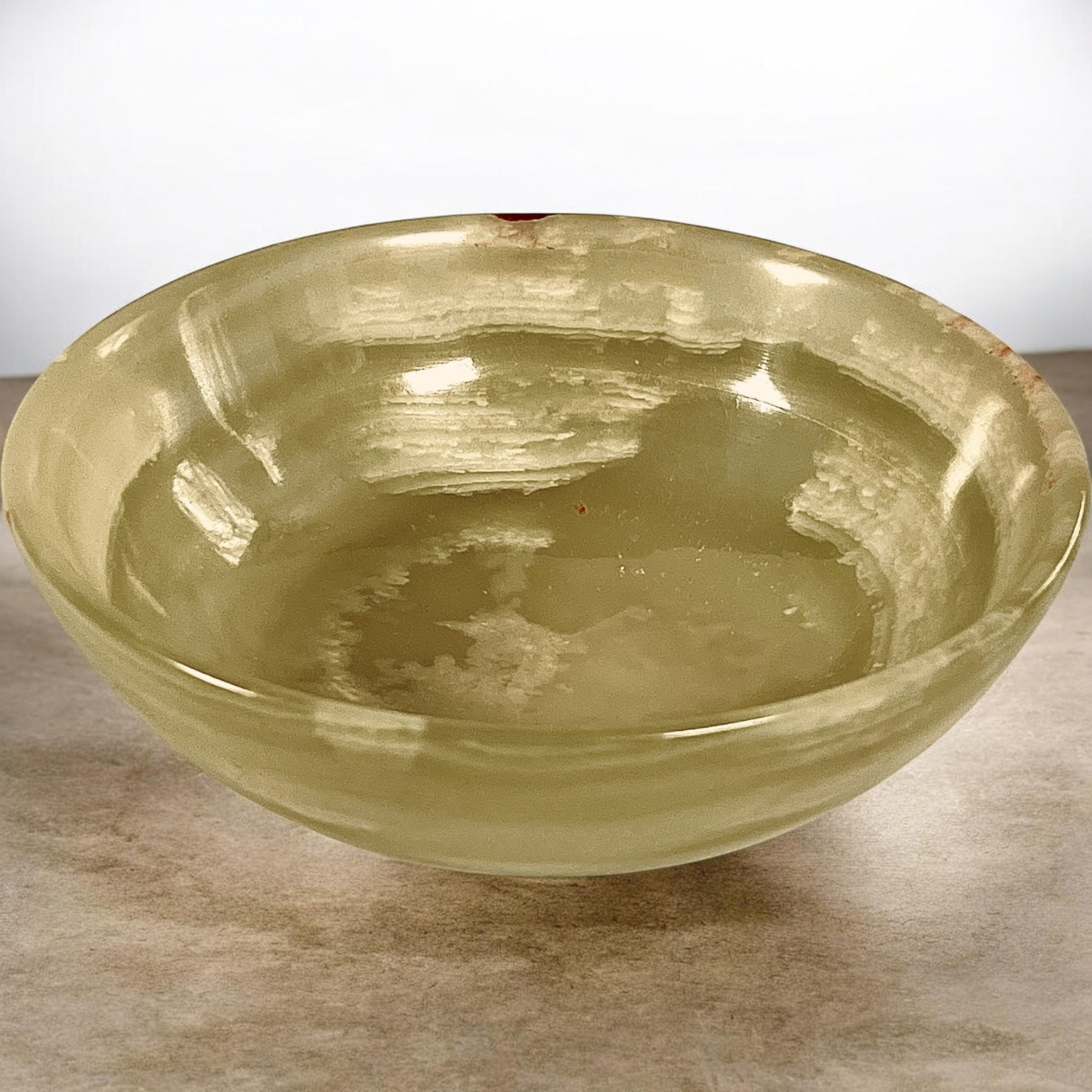 The Meadow Onyx Bowl is inspired by the quiet freshness of new growth and soft green landscapes. Hand-carved from natural rainbow onyx, the bowl reveals gentle layers of pale sage, creamy ivory, and subtle caramel veining, giving each piece a soothing, organic presence.