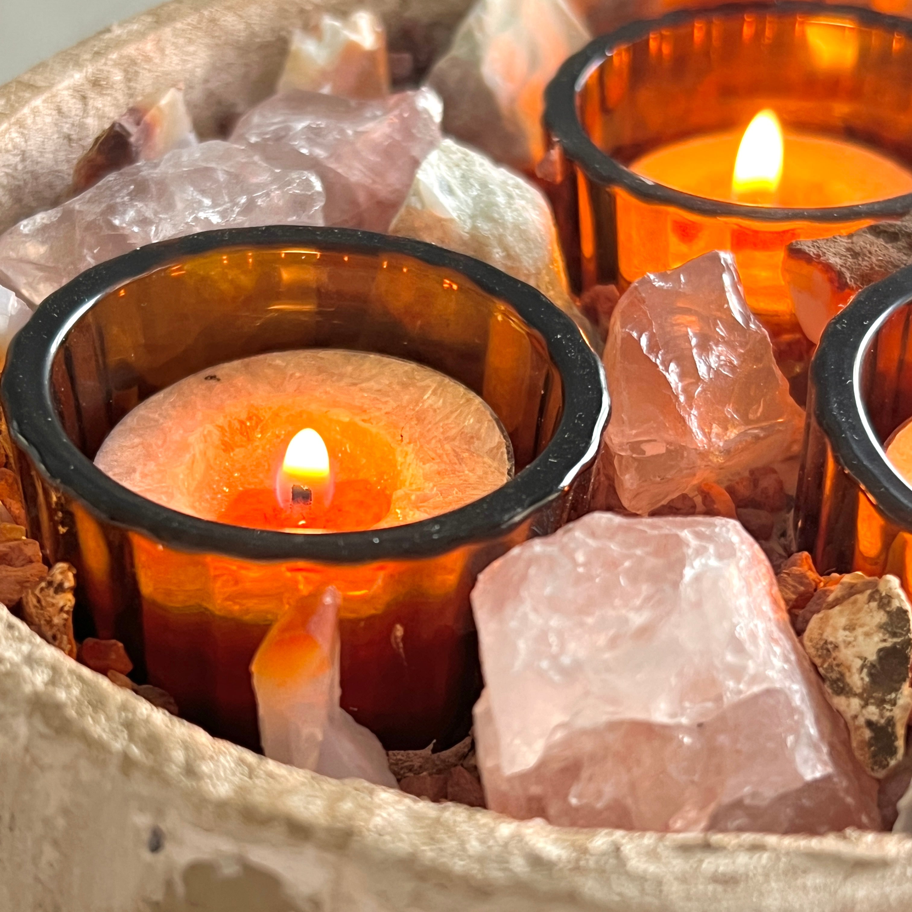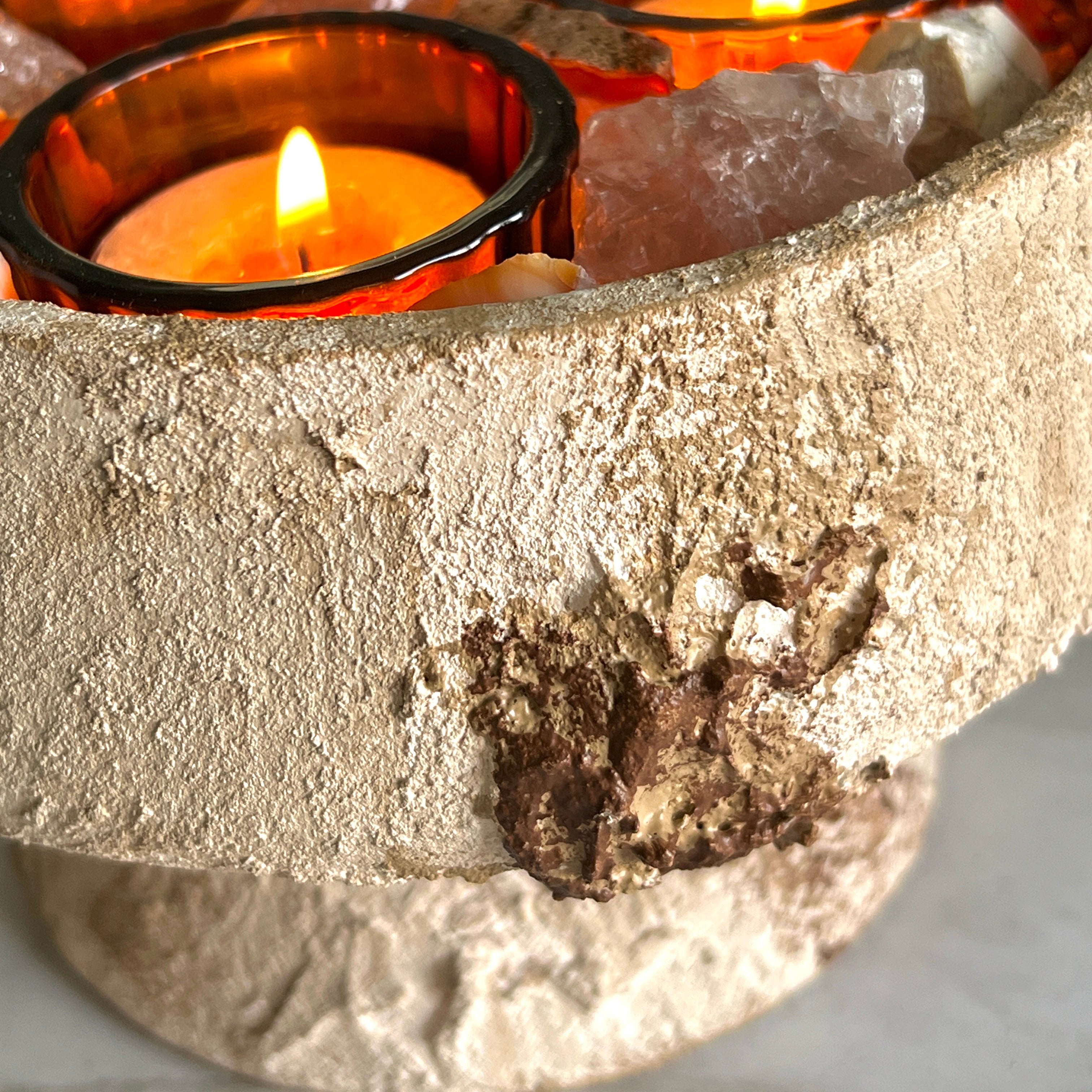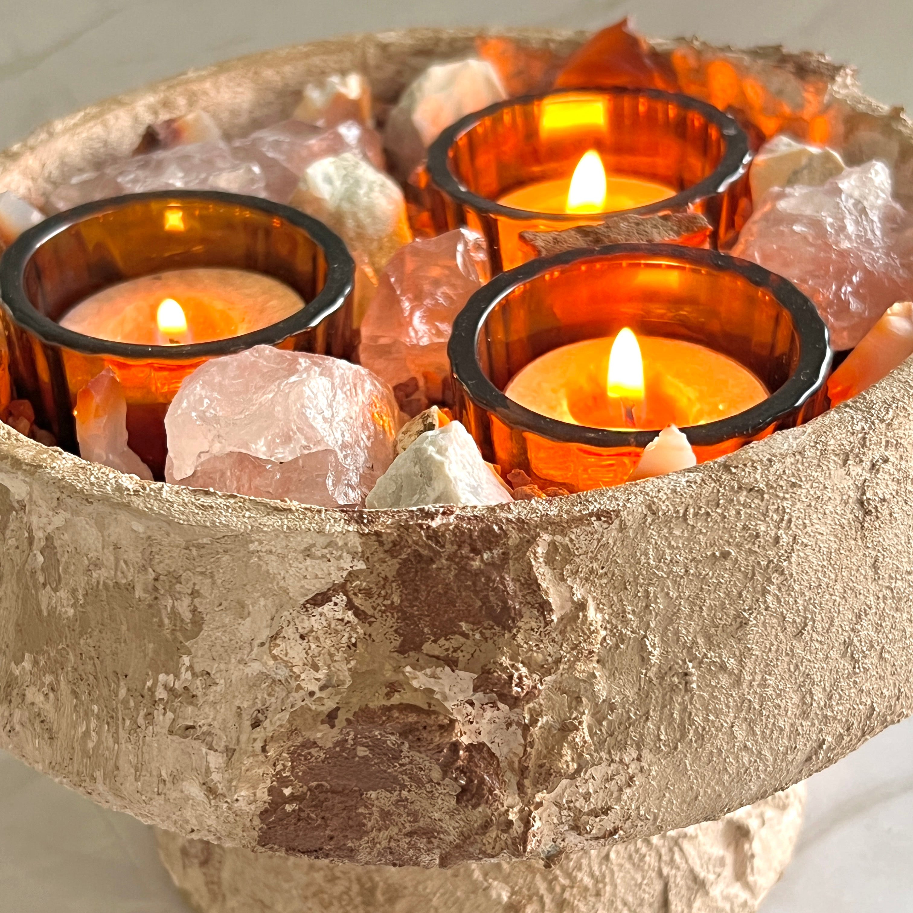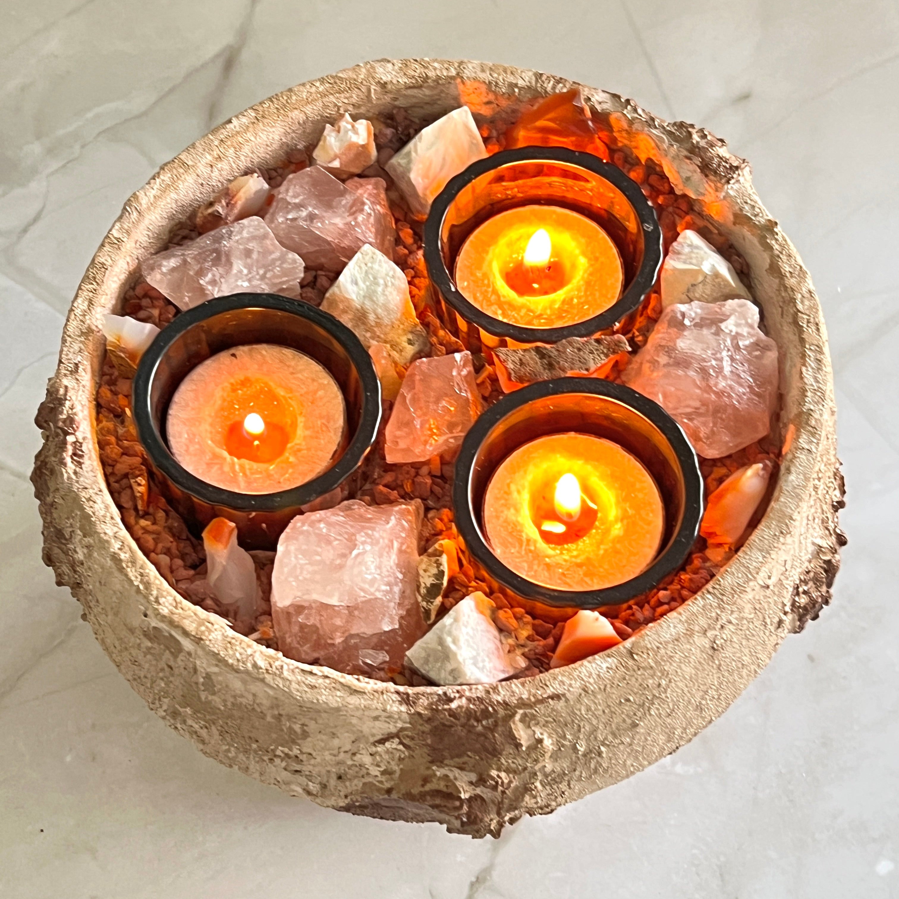 The dynamic combination of these powerful stones creates a captivating cosmic presence, while the soft glow of the tealights enhances the natural patterns and inner fire of each crystal. Whether placed on a creative workspace, dining table, or meditation altar, NEBULA becomes a bold focal point that blends artisan craftsmanship with elemental energy.