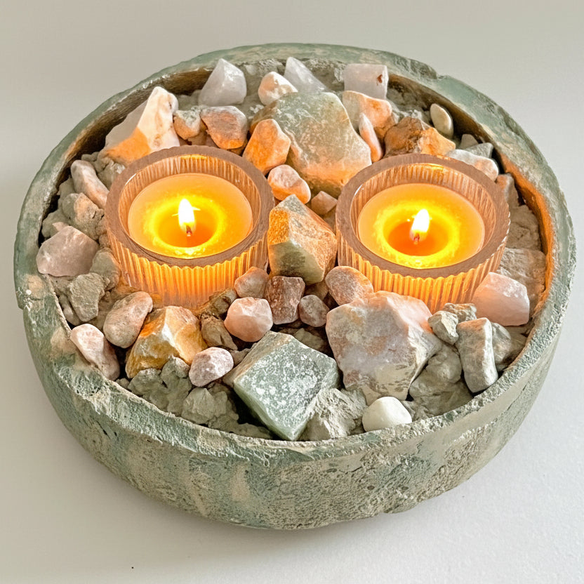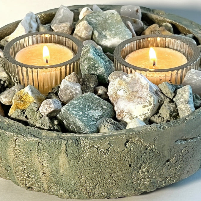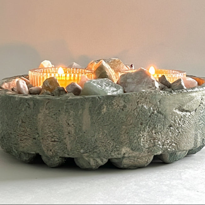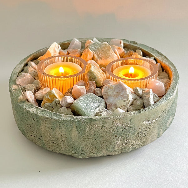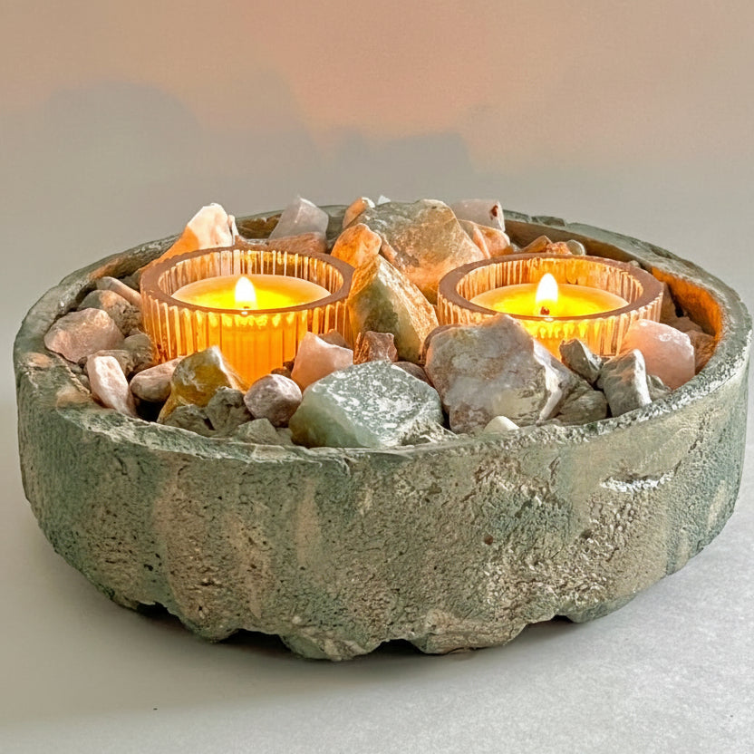 The harmonious blend of these nurturing stones creates a peaceful, nature-inspired presence, while the soft glow of the tealights enhances the natural shimmer of aventurine and the unique patterns of orbicular jasper. Whether placed on a meditation altar, bedside table, or living room centerpiece, ONDA becomes a tranquil focal point that blends artisan craftsmanship with elemental serenity.
