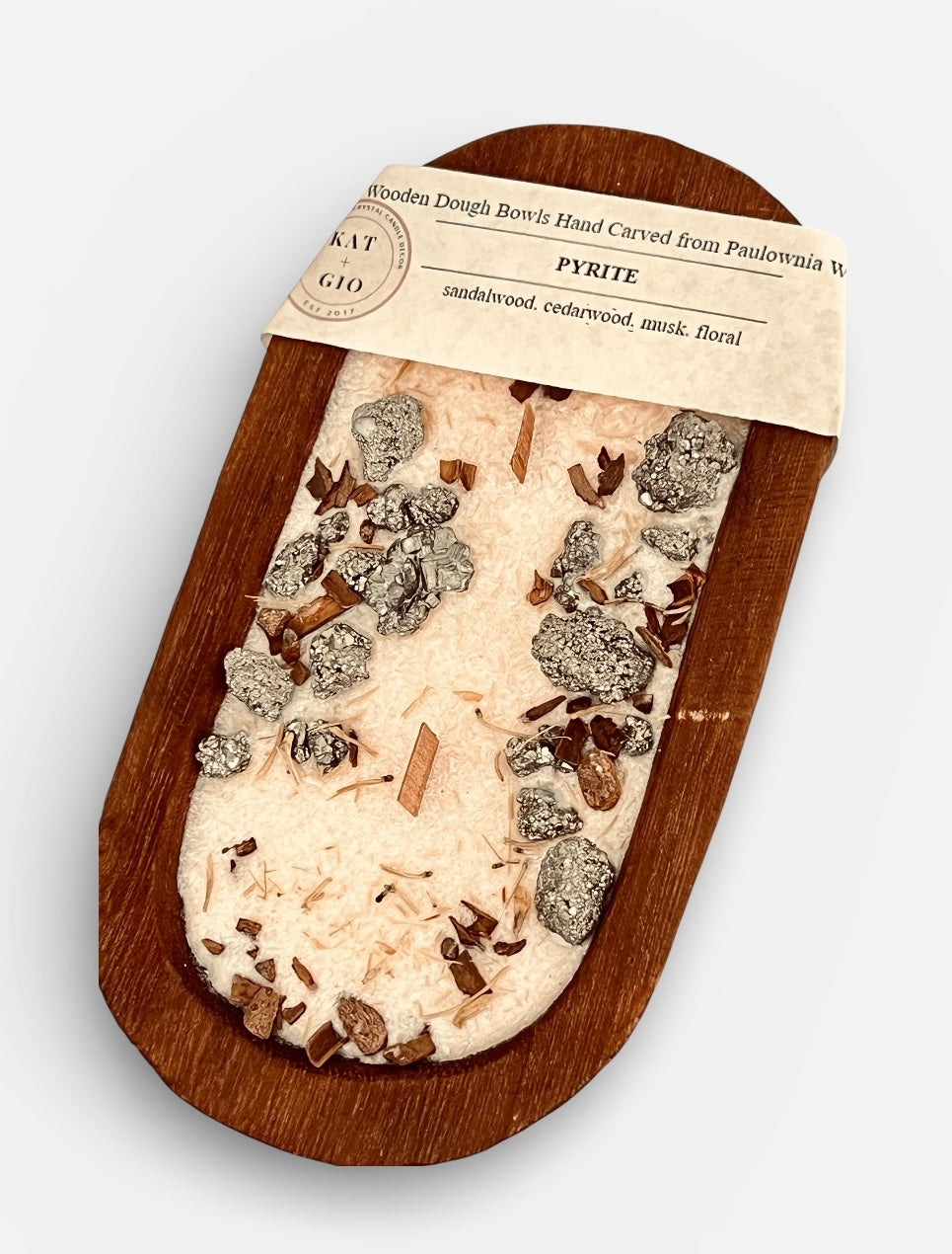 Set in a solid Paulownia wood dough bowl, the raw metallic shimmer of pyrite contrasts beautifully with the warmth of the wood, creating an earthy yet elevated statement piece. Each candle is one of a kind, thoughtfully made to bring intention, warmth, and quiet strength into your space.