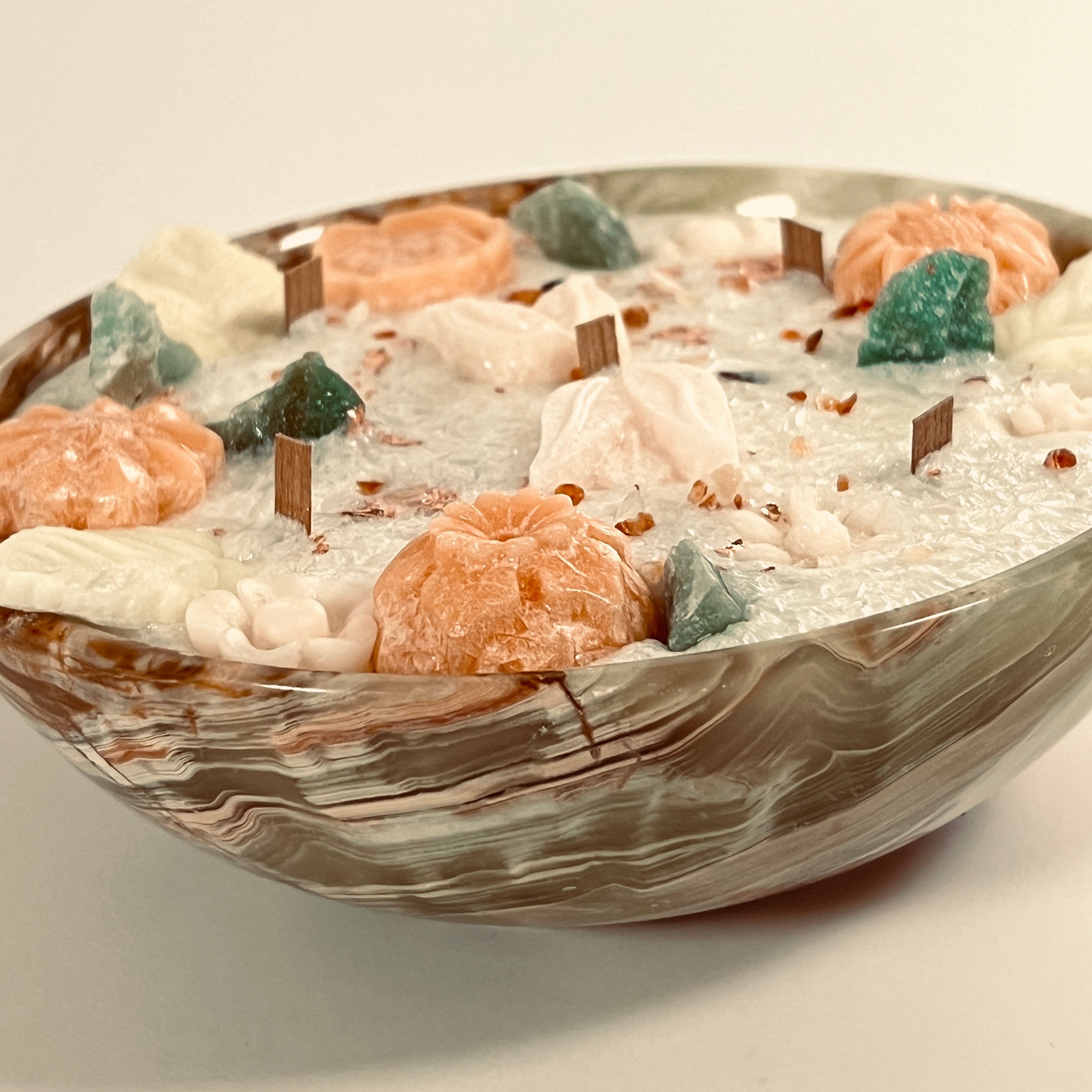 When lit, the gentle flame illuminates the translucent onyx and mineral accents, transforming the piece into a calming centerpiece. Designed as both candle and décor, the stone bowl remains a timeless accent long after the candle has finished burning.
