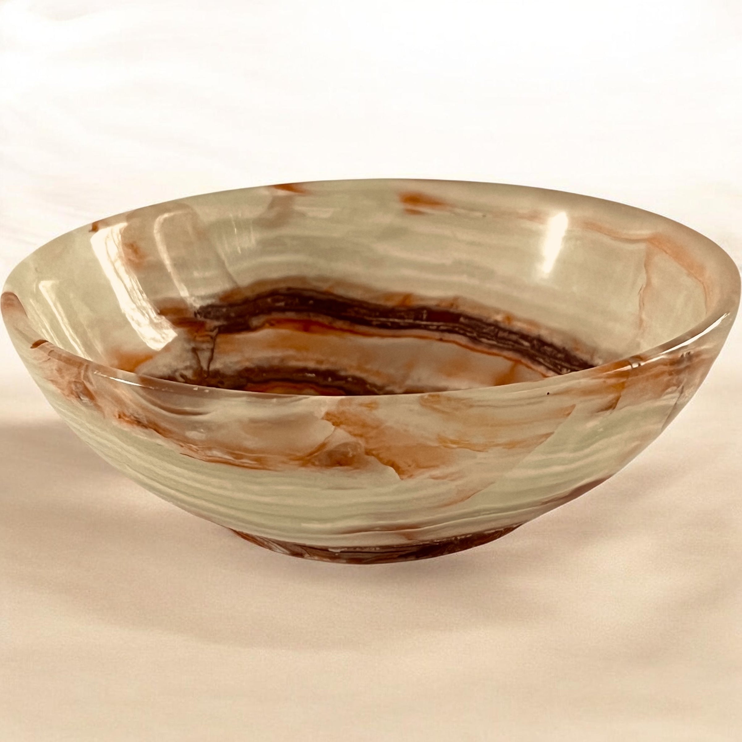The Verdant Onyx Bowl draws inspiration from the quiet richness of nature—soft foliage tones, warm earth accents, and gentle light. Hand-carved from natural rainbow onyx, the bowl features layered bands of muted sage green, creamy ivory, and warm caramel along the rim, creating a soothing, organic palette unique to each piece.