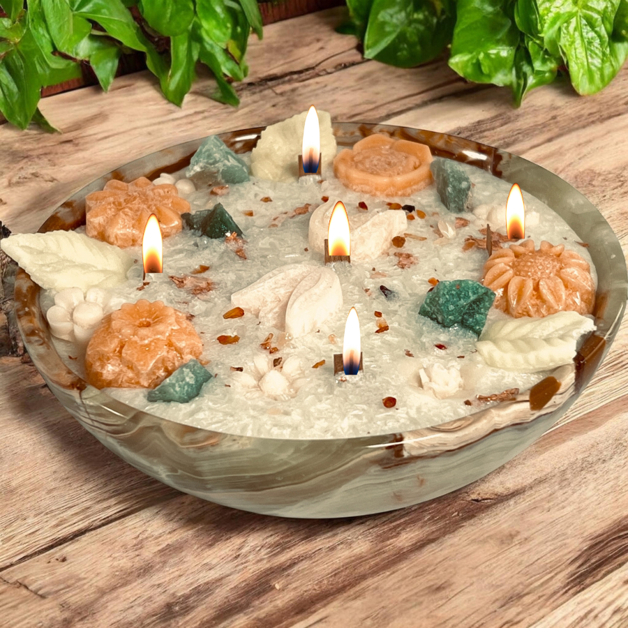 Bring balance and natural beauty to your space with this handcrafted crystal candle centerpiece.