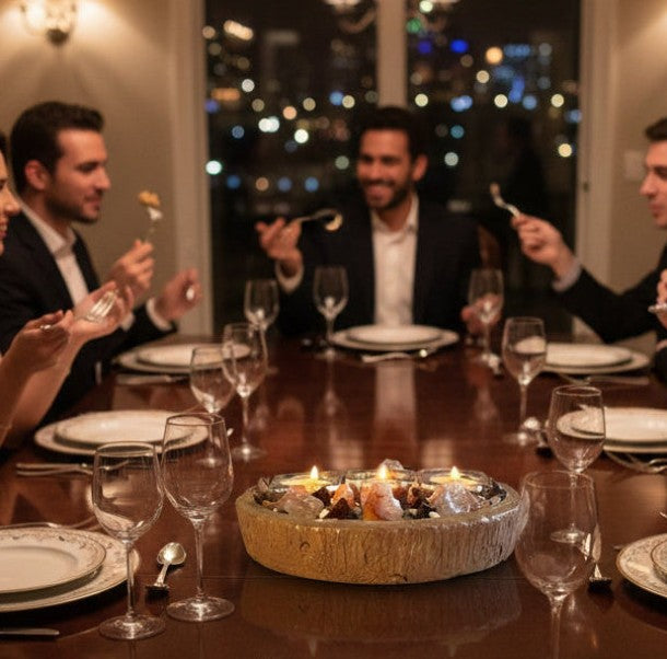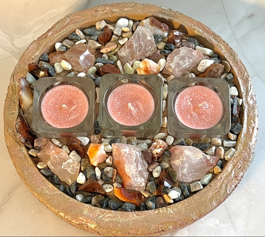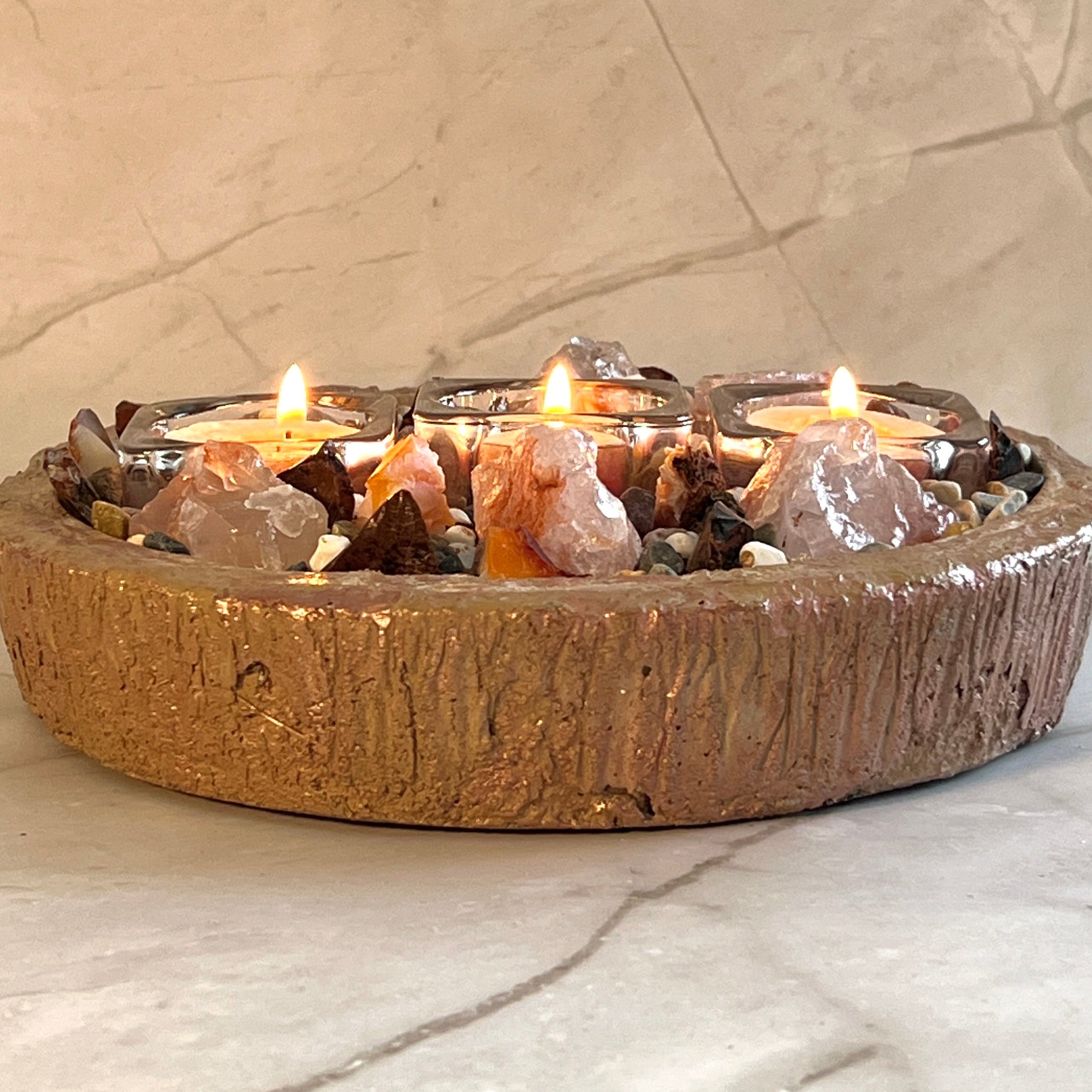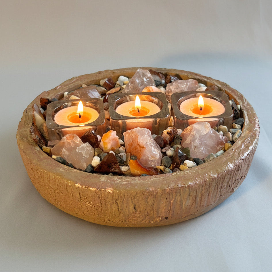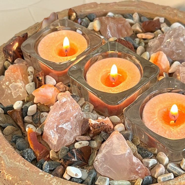 The vibrant energy of these powerful stones creates a captivating presence, while the soft glow of the tealights enhances the natural warmth and inner fire of each crystal. Whether placed on a dining table, creative workspace, or meditation altar, ECLISSE becomes a bold focal point that blends artisan craftsmanship with elemental passion.