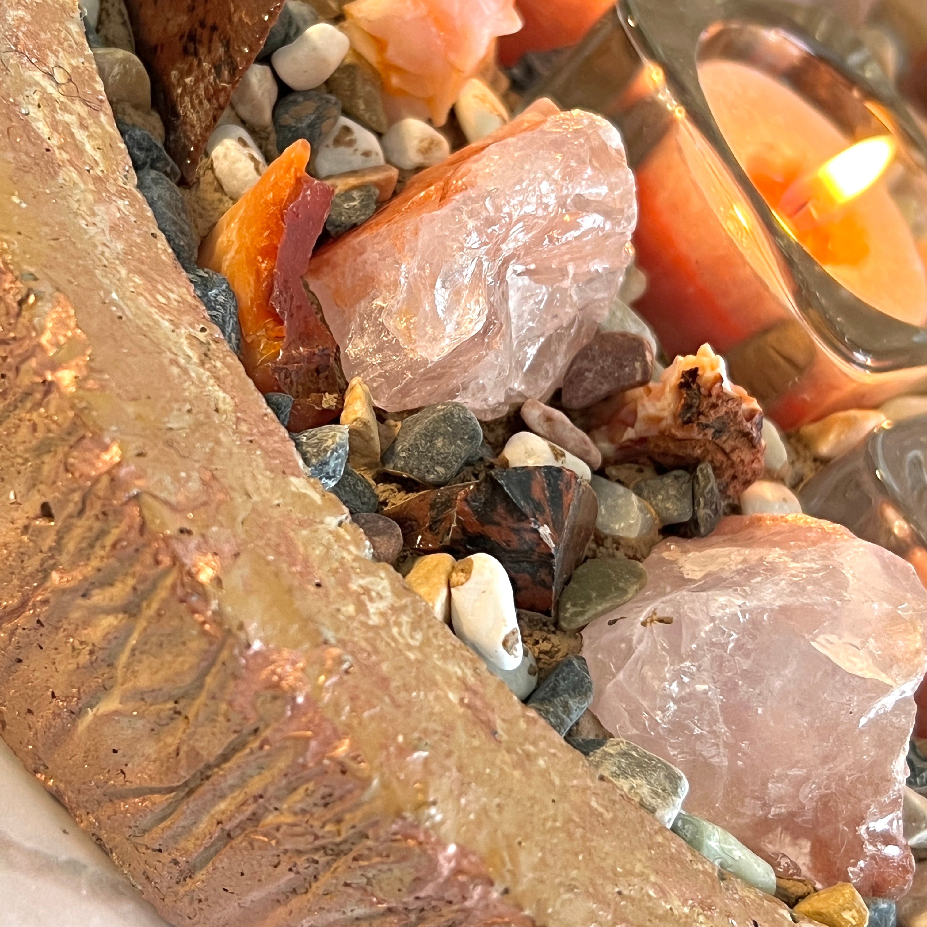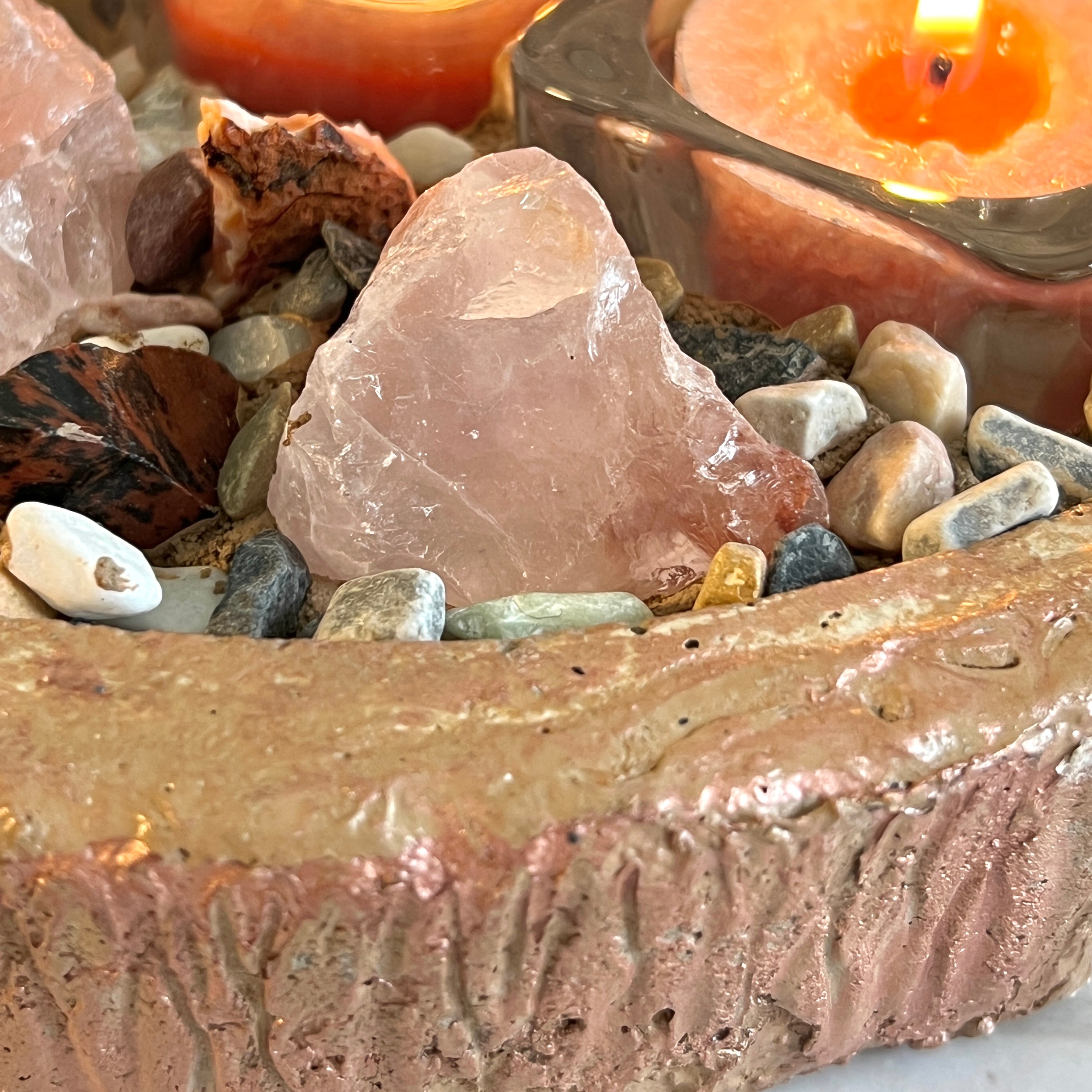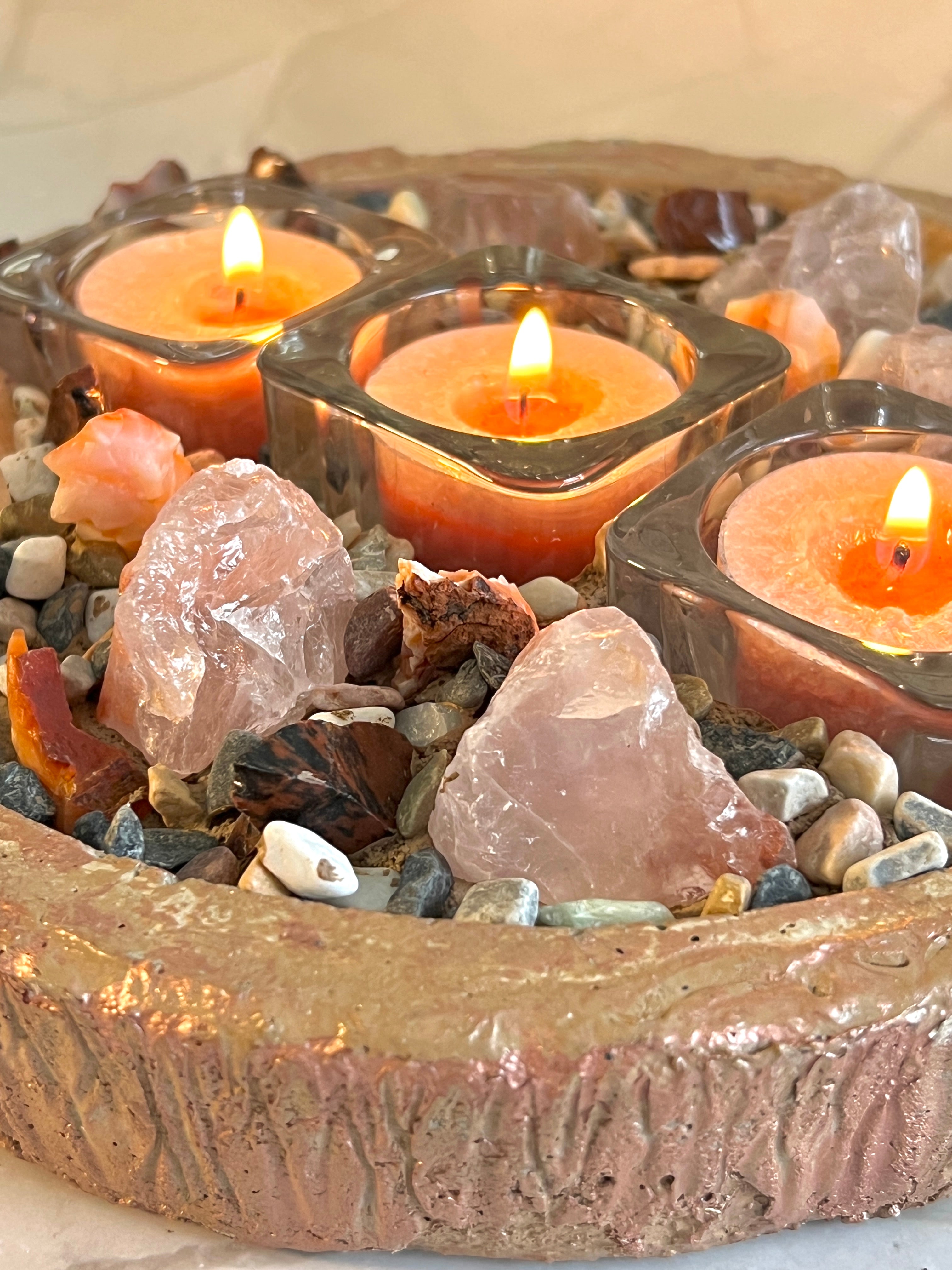 ECLISSE is a handcrafted Luminesa crystal candlescape designed to bring passionate energy and grounded strength into your space. Sculpted by hand from raw concrete and adorned with genuine mahogany obsidian, fire quartz, and carnelian agate, this piece carries a rich palette of deep browns, fiery oranges, and warm amber tones.