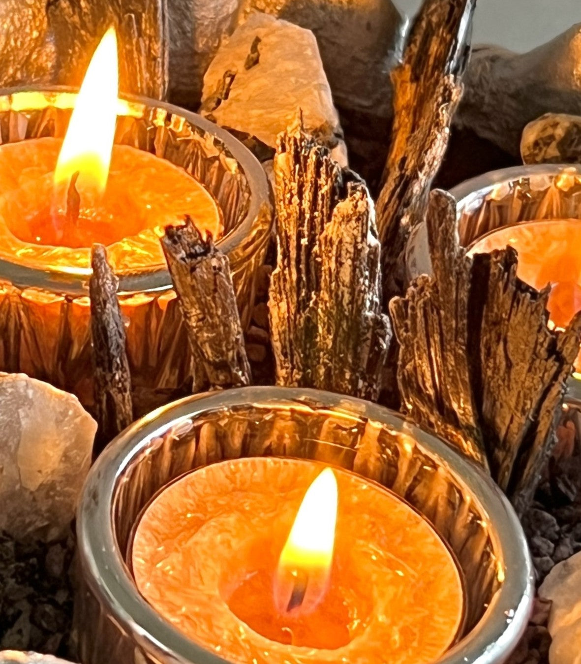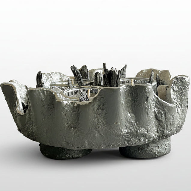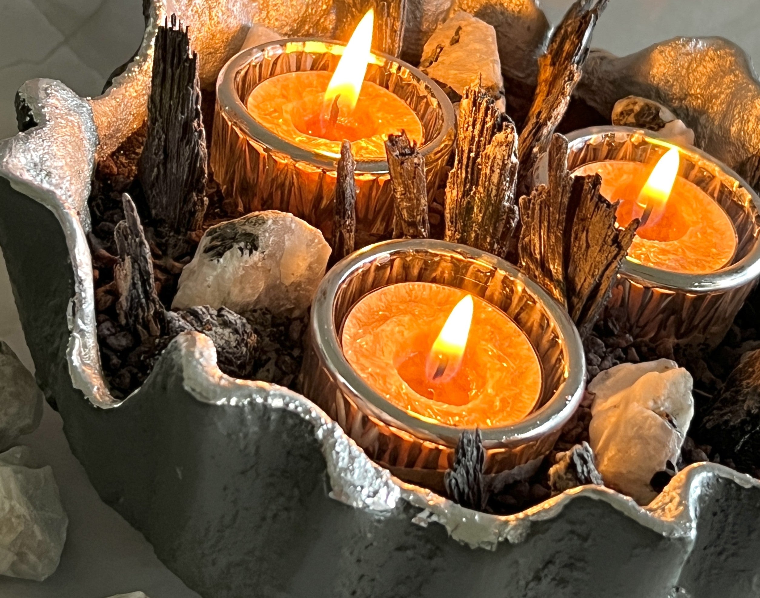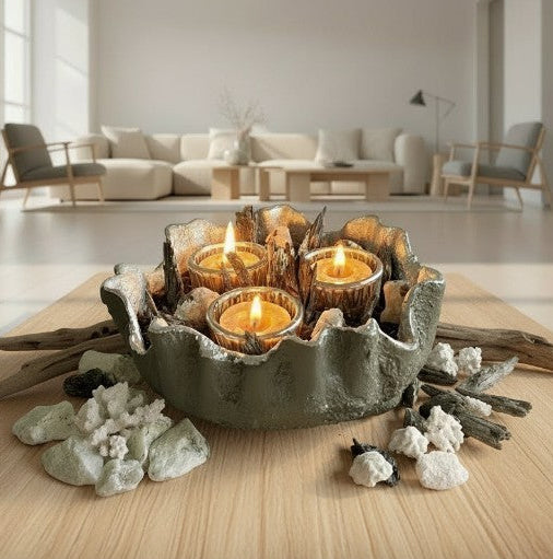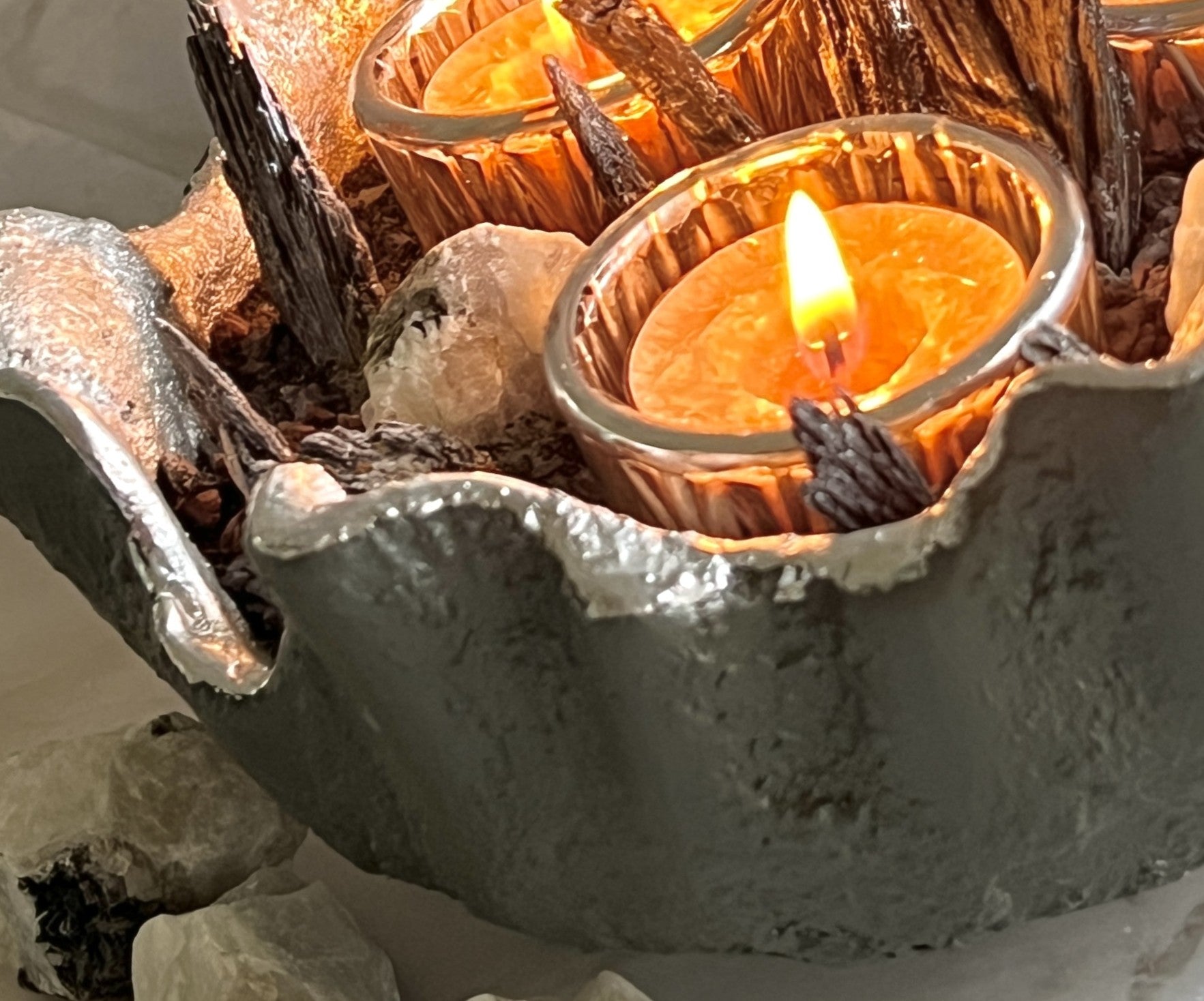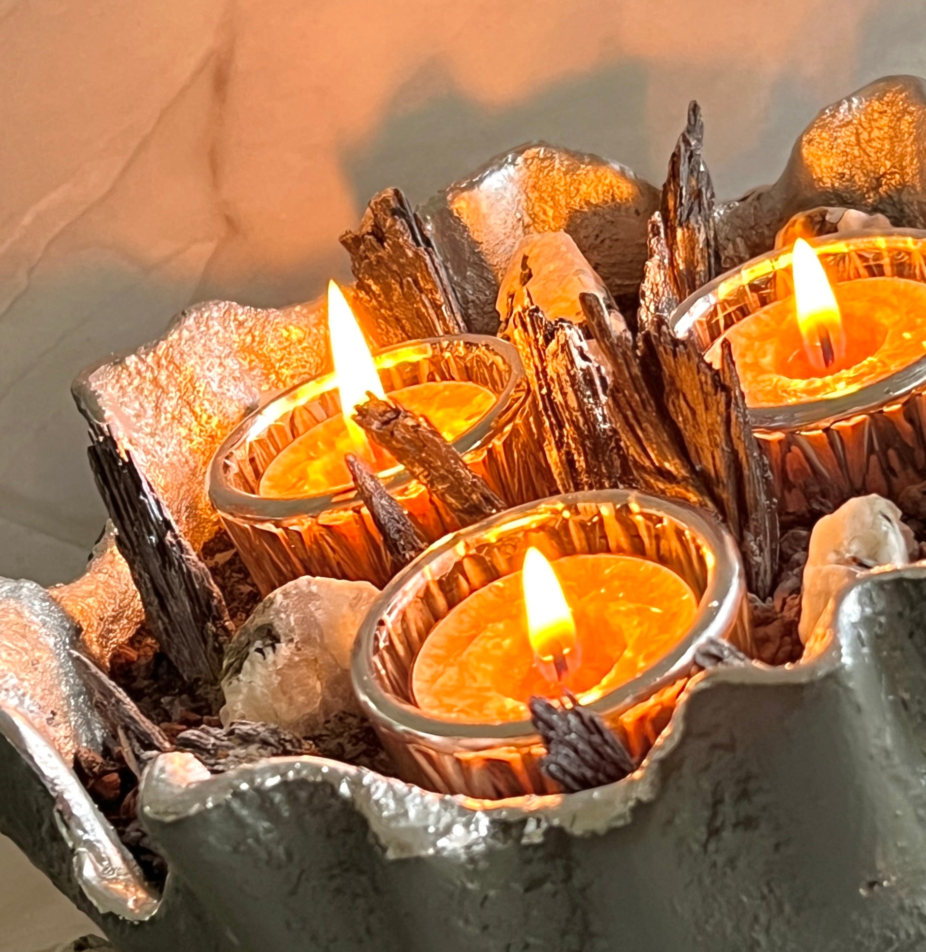 Each candlescape is one-of-a-kind, shaped and finished by hand. Designed with replaceable tealight candles, it can be enjoyed again and again—an enduring decorative piece that evolves with every glow.