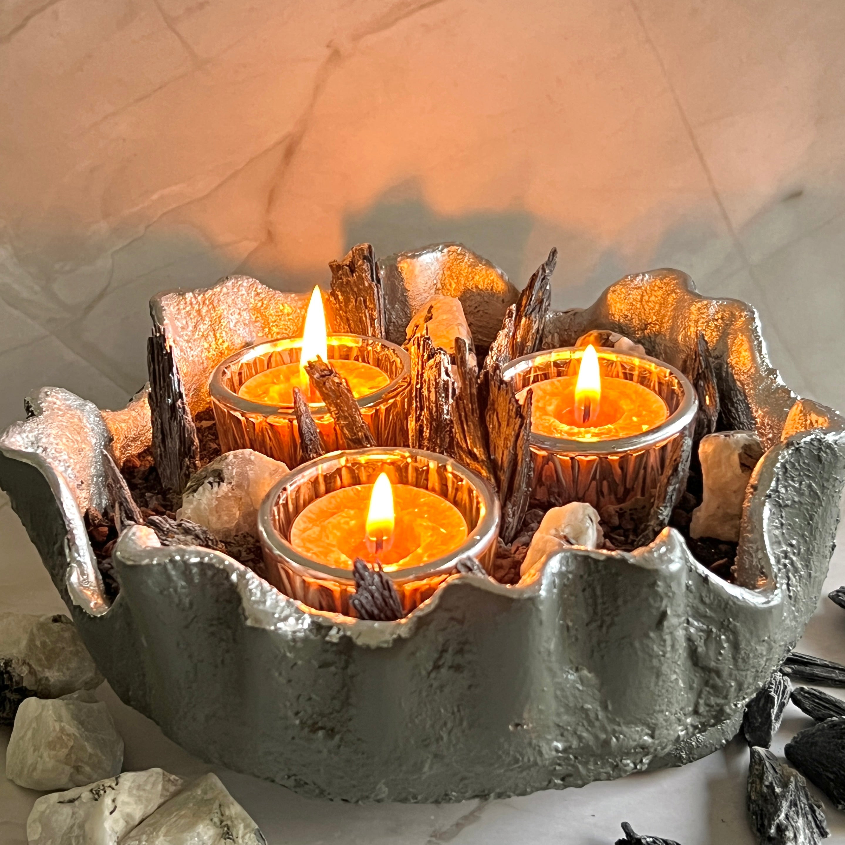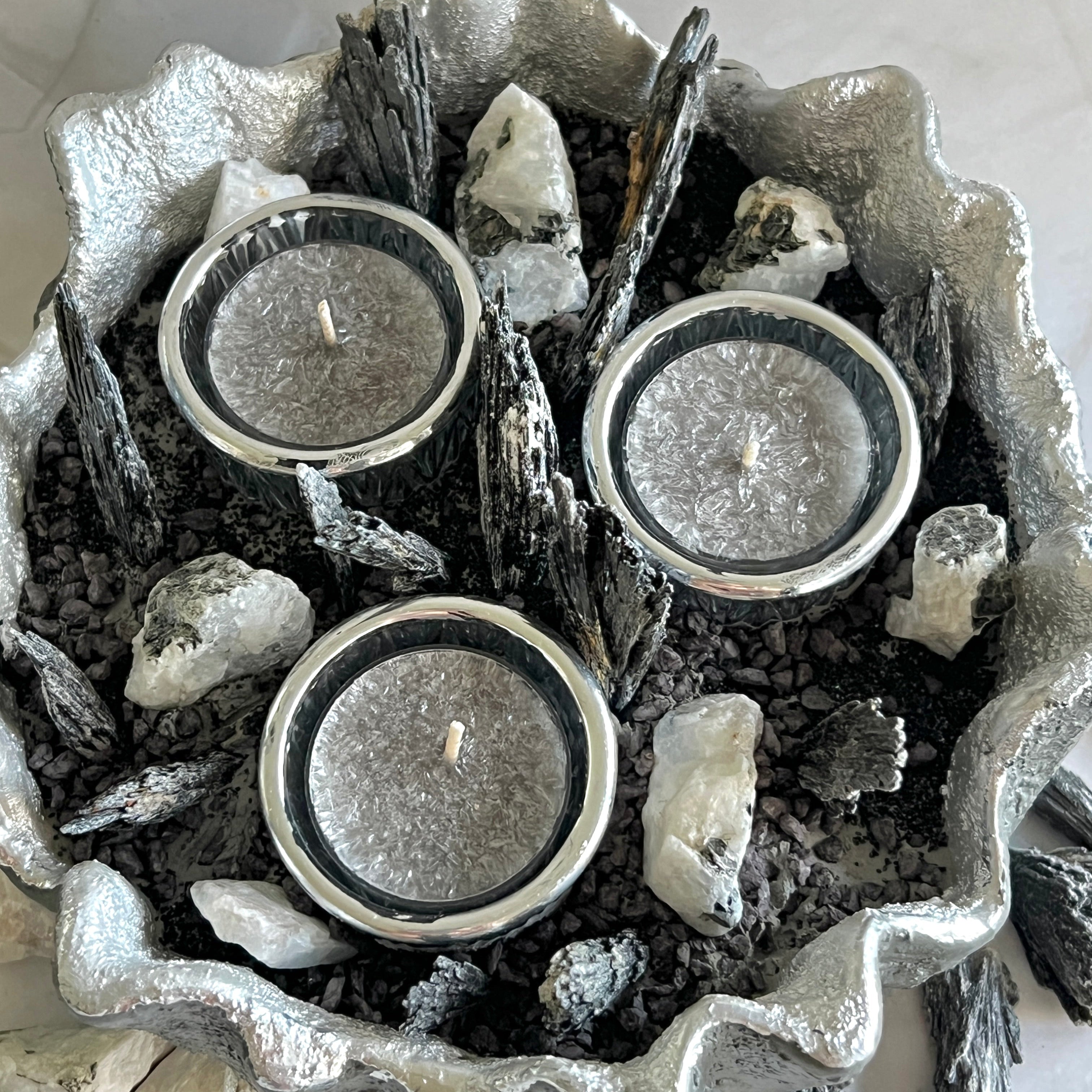 The dramatic contrast of these powerful stones creates a captivating presence, while the soft glow of the tealights enhances the natural iridescence of the moonstone. Whether placed on a meditation altar, coffee table, or bedroom sanctuary, TERRA becomes a mystical focal point that blends artisan craftsmanship with elemental beauty.