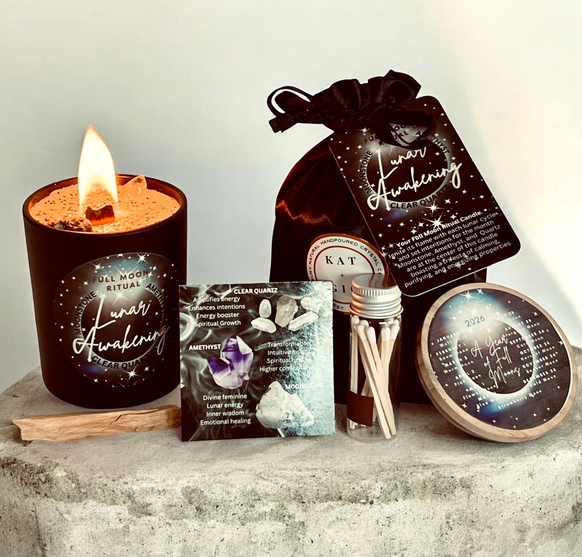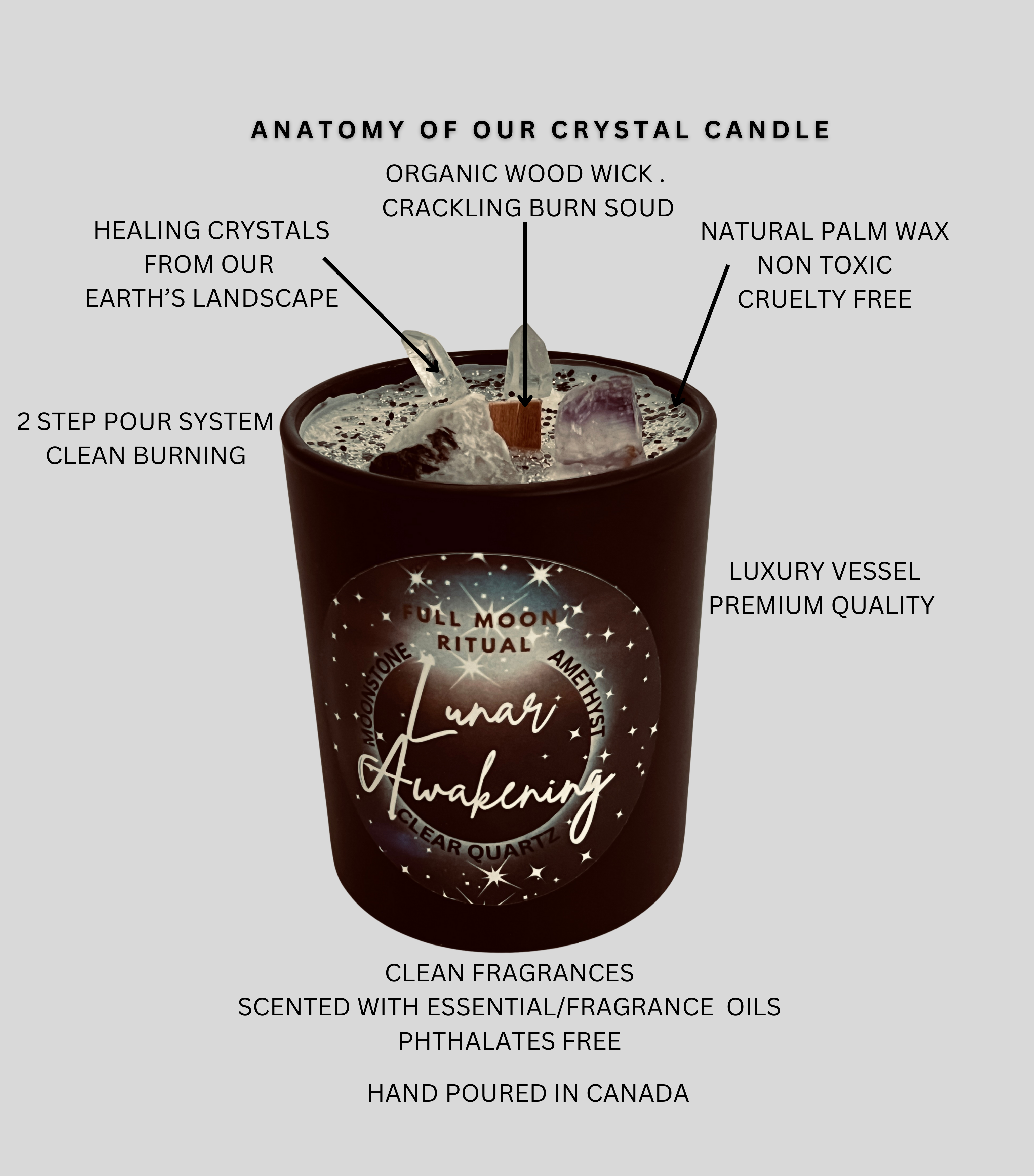 Calling all moon magic enthusiasts! We’re thrilled to offer Lunar Awakening…The Full Moon Ritual Crystal Candle! Embrace the Lunar Energies