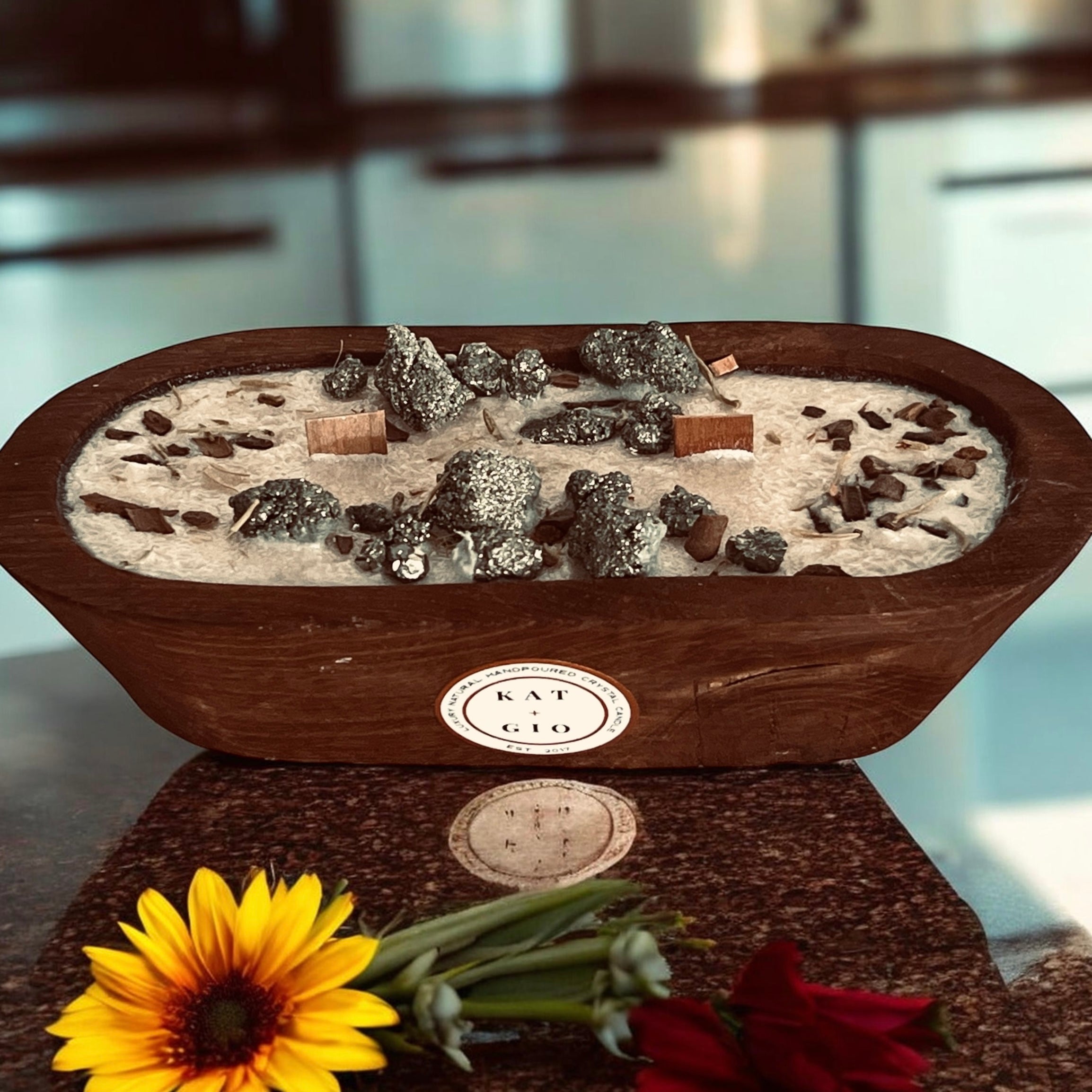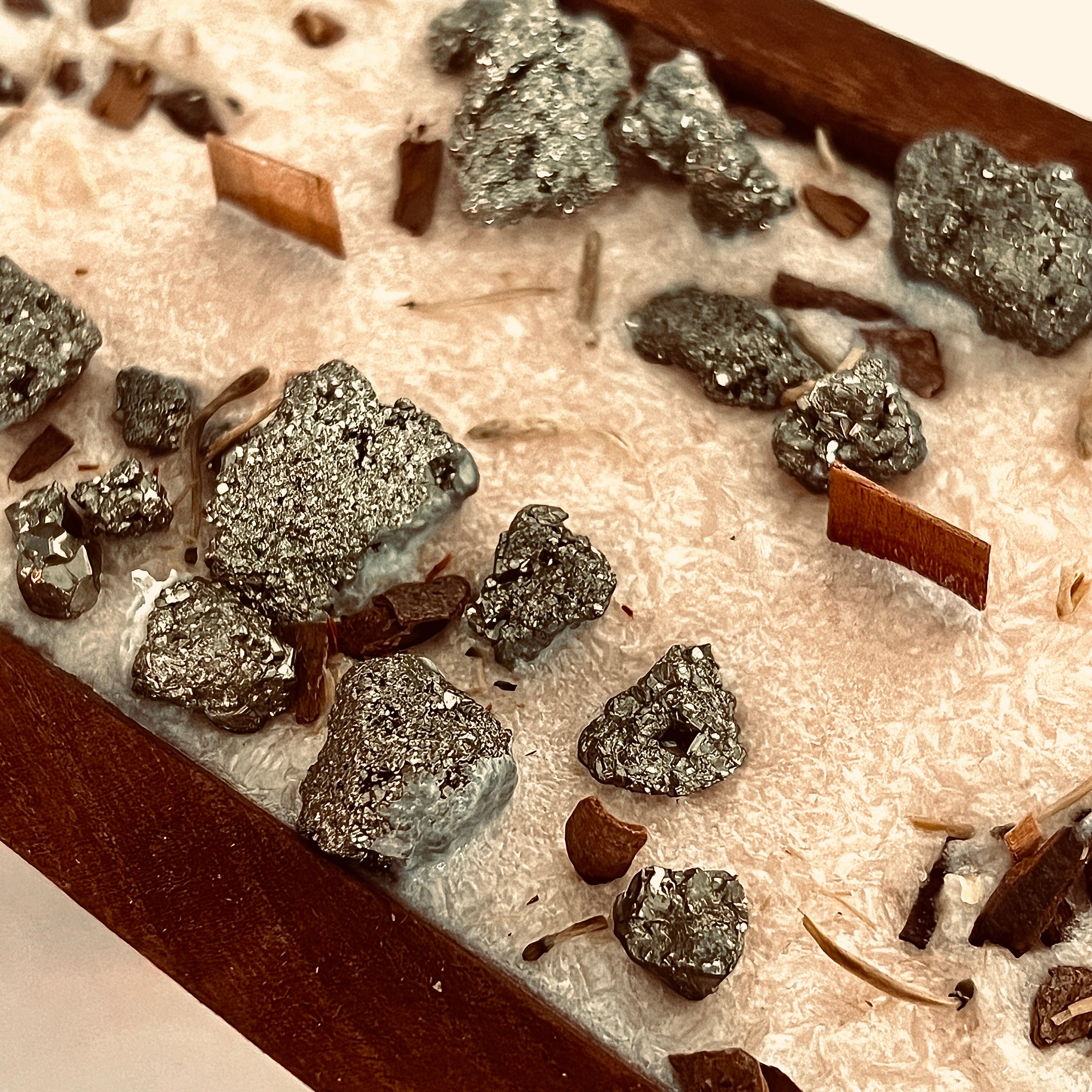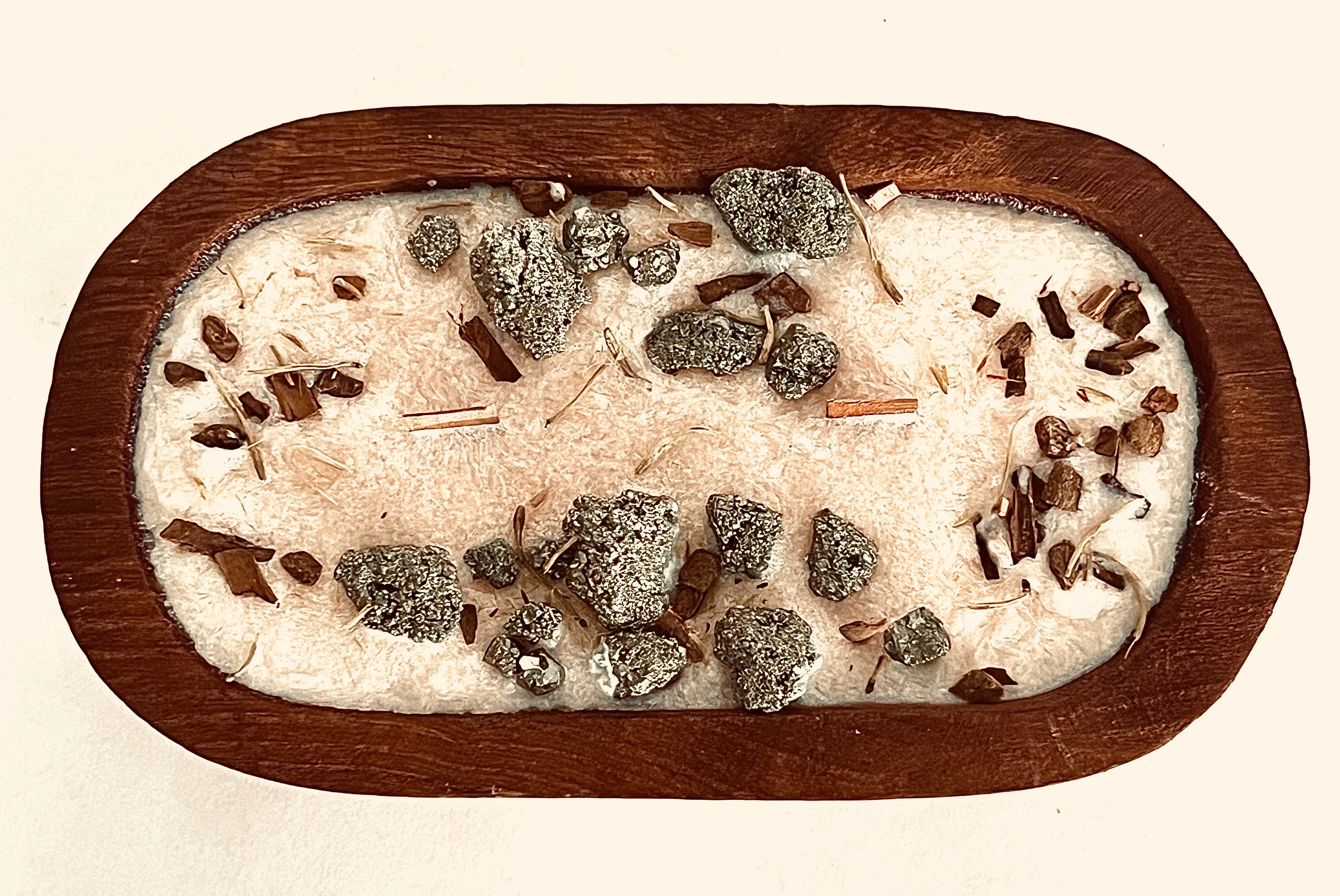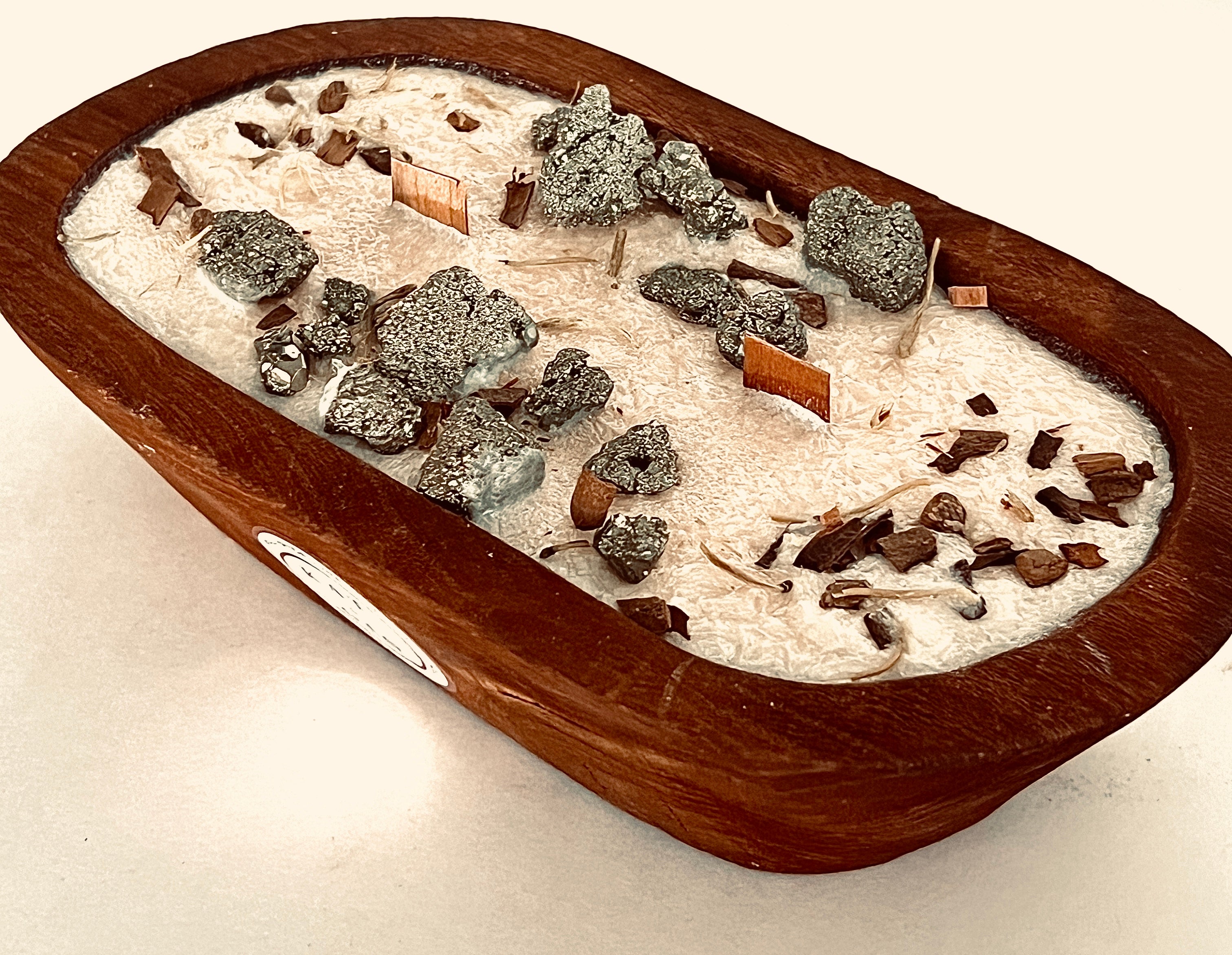 This handcrafted dough bowl candle arrangement features pyrite, known for its bold, grounding presence and association with abundance and confidence. Poured with natural palm wax and finished with organic wood wicks, it offers a clean, slow burn with a soft, comforting crackle. Set in a solid wood dough bowl, the raw metallic shimmer of pyrite contrasts beautifully with the warmth of the wood, creating an earthy yet elevated statement piece. Each candle is one of a kind, thoughtfully made to bring intention, warmth, and quiet strength into your space.