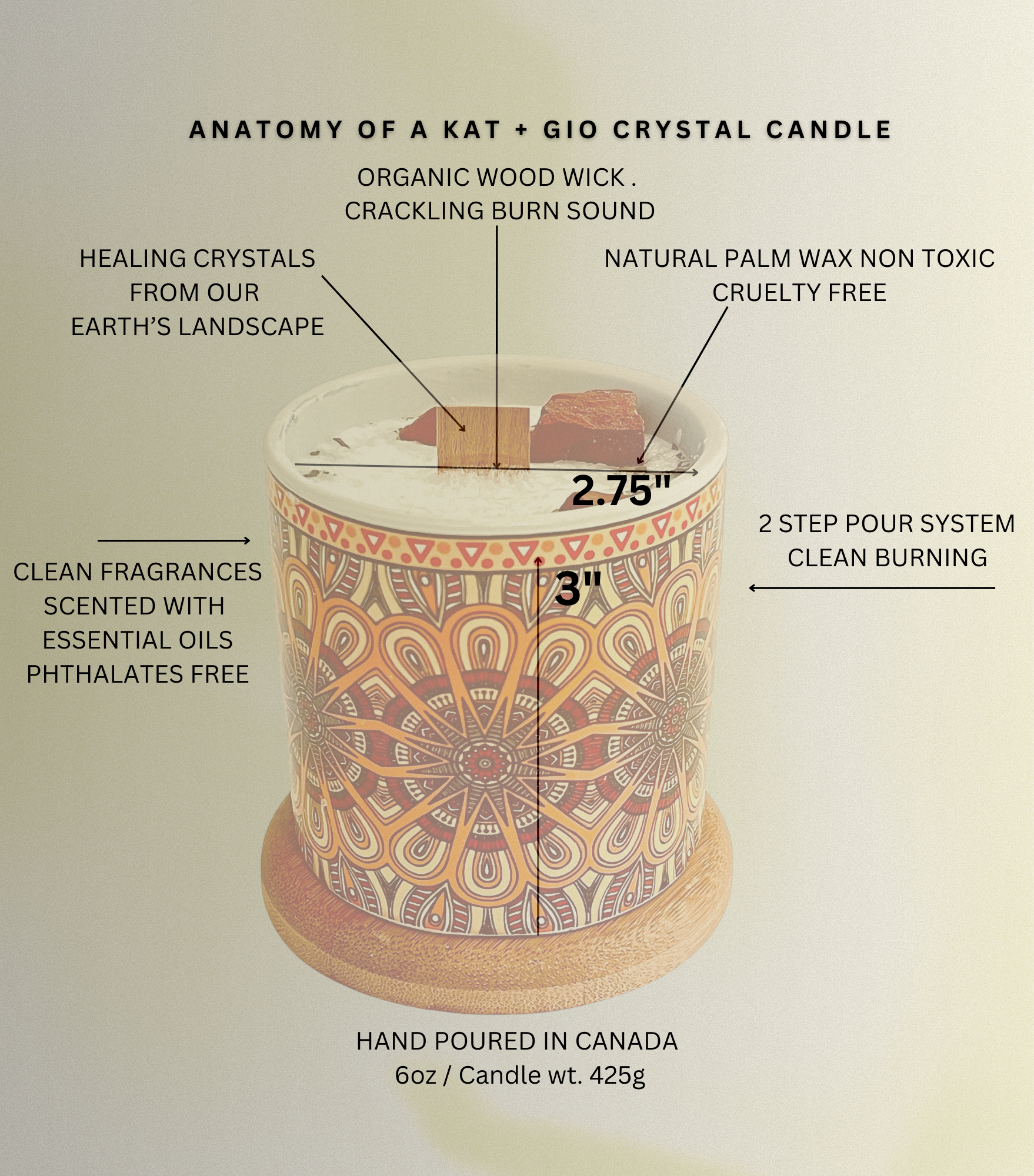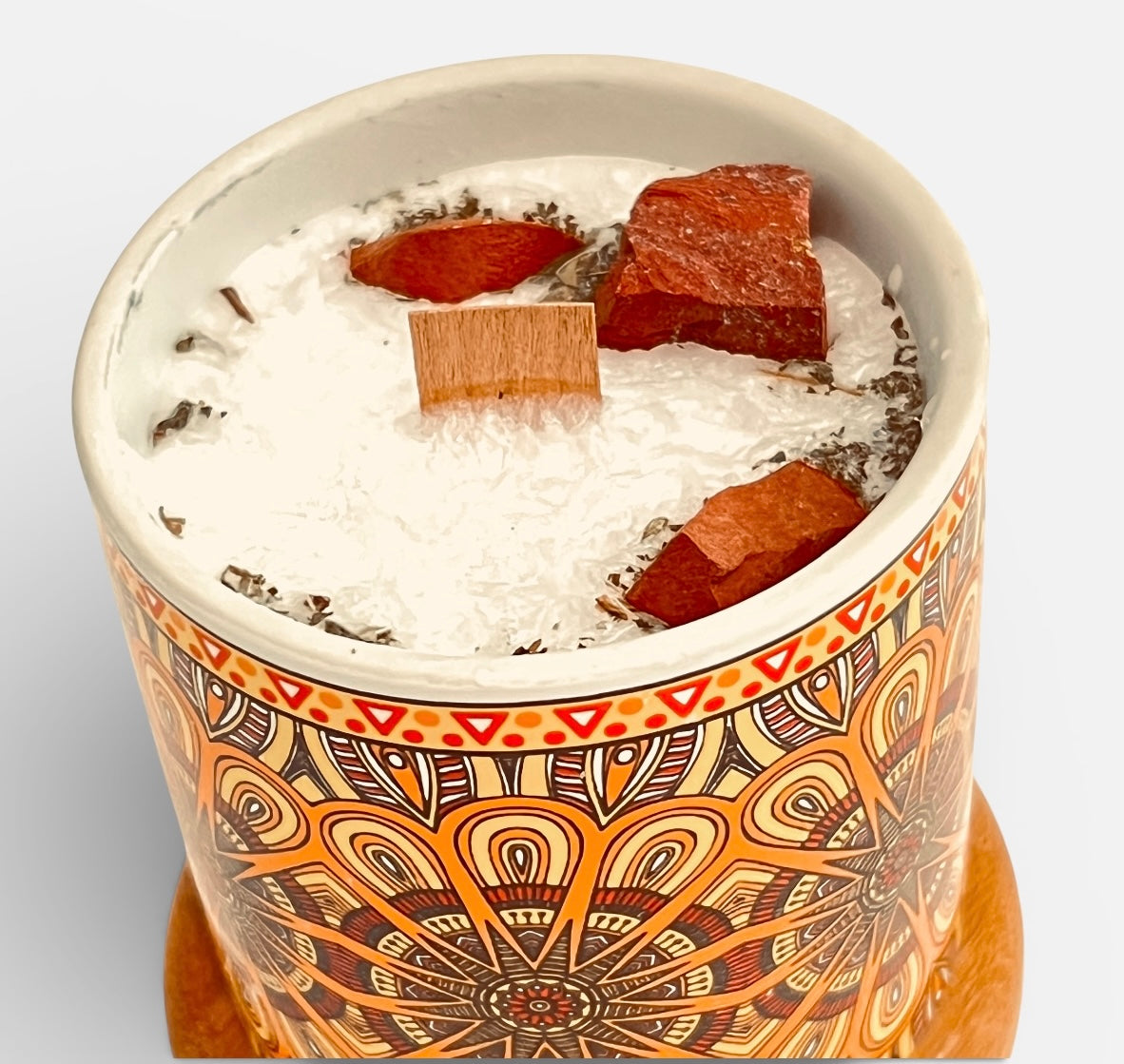 Infused with stabilizing red jasper, this is a candle of strength, endurance, and grounded vitality. Red jasper is known for its nurturing, protective qualities, helping to anchor energy while encouraging courage and steady focus. As the wooden wick glows, this candle fills the space with a warm, reassuring presence—ideal for grounding rituals, resilience, and daily intention-setting.