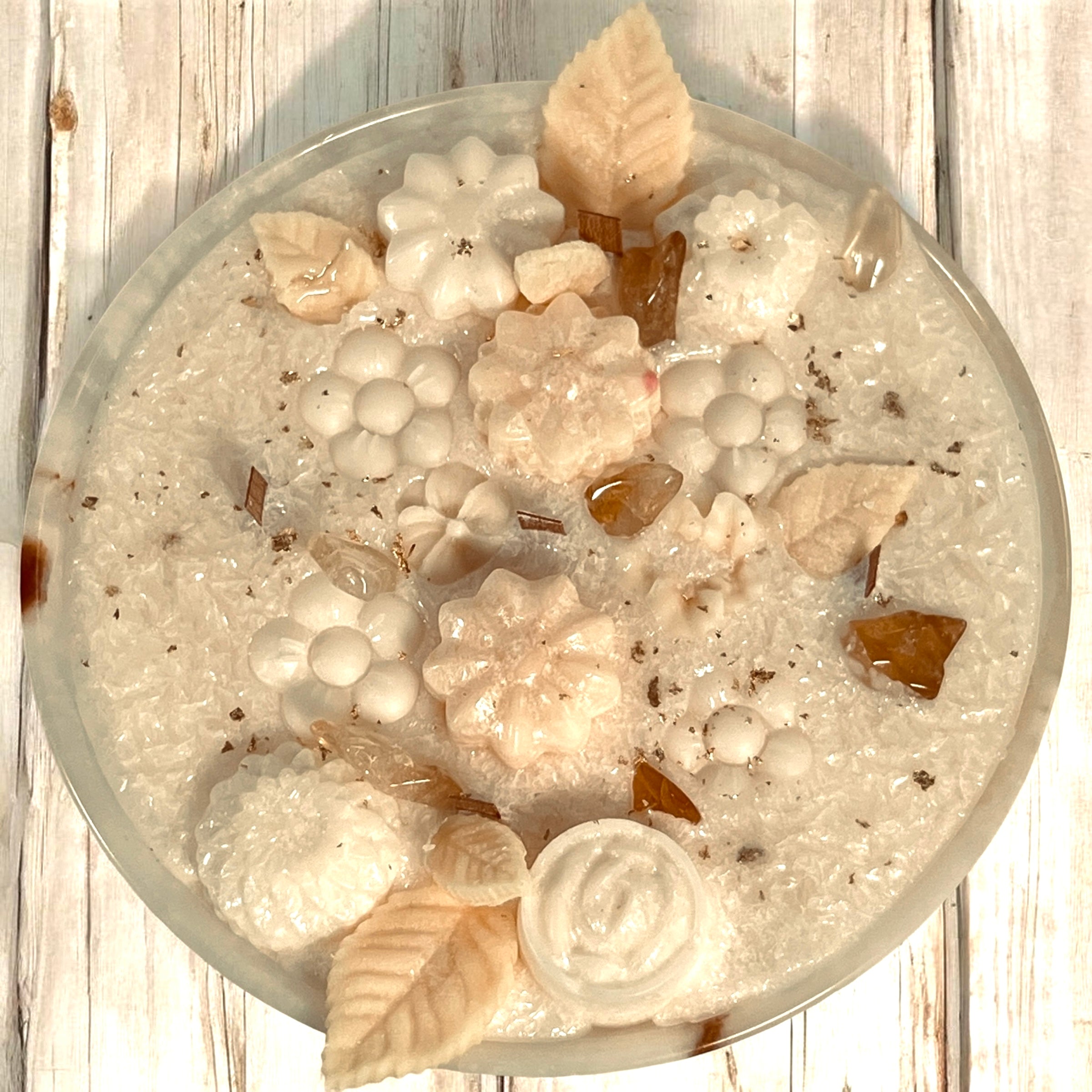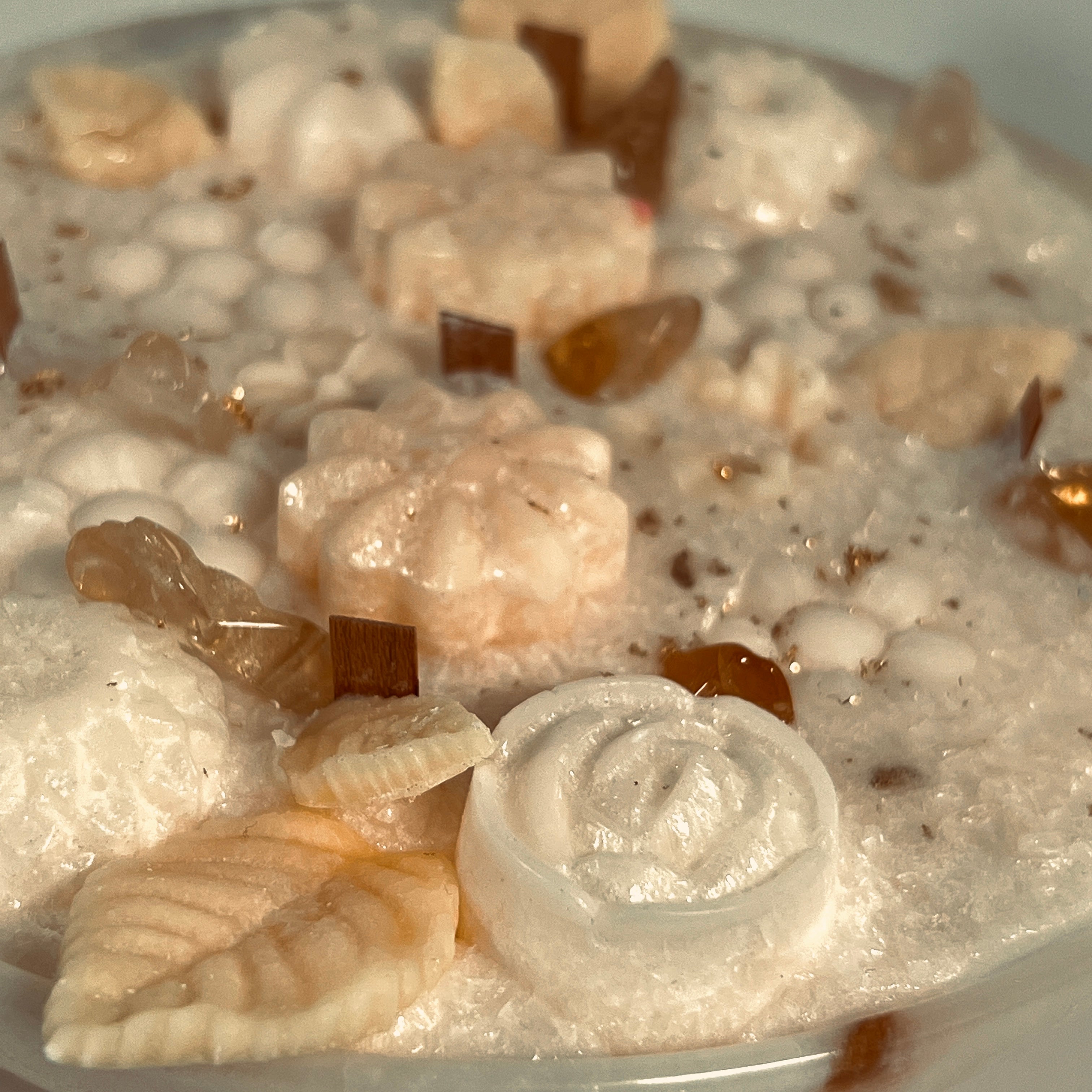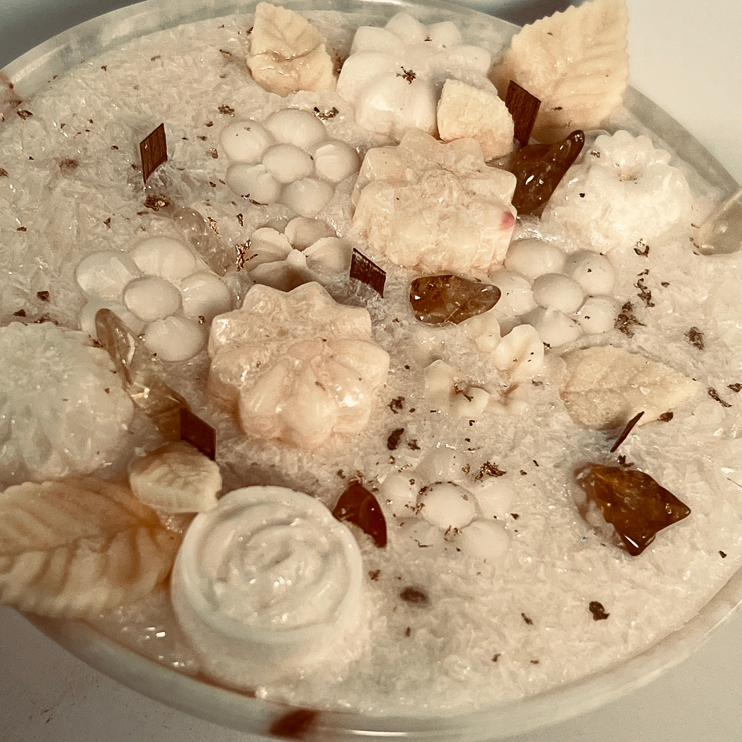 A bed of crystallized palm wax creates a shimmering, textured surface, adorned with hand-poured florals, natural honey calcite crystals, and wooden wicks. The warm golden tones of the calcite bring a soft radiance to the neutral palette, evoking the comforting glow of candlelight and the richness of natural stone.