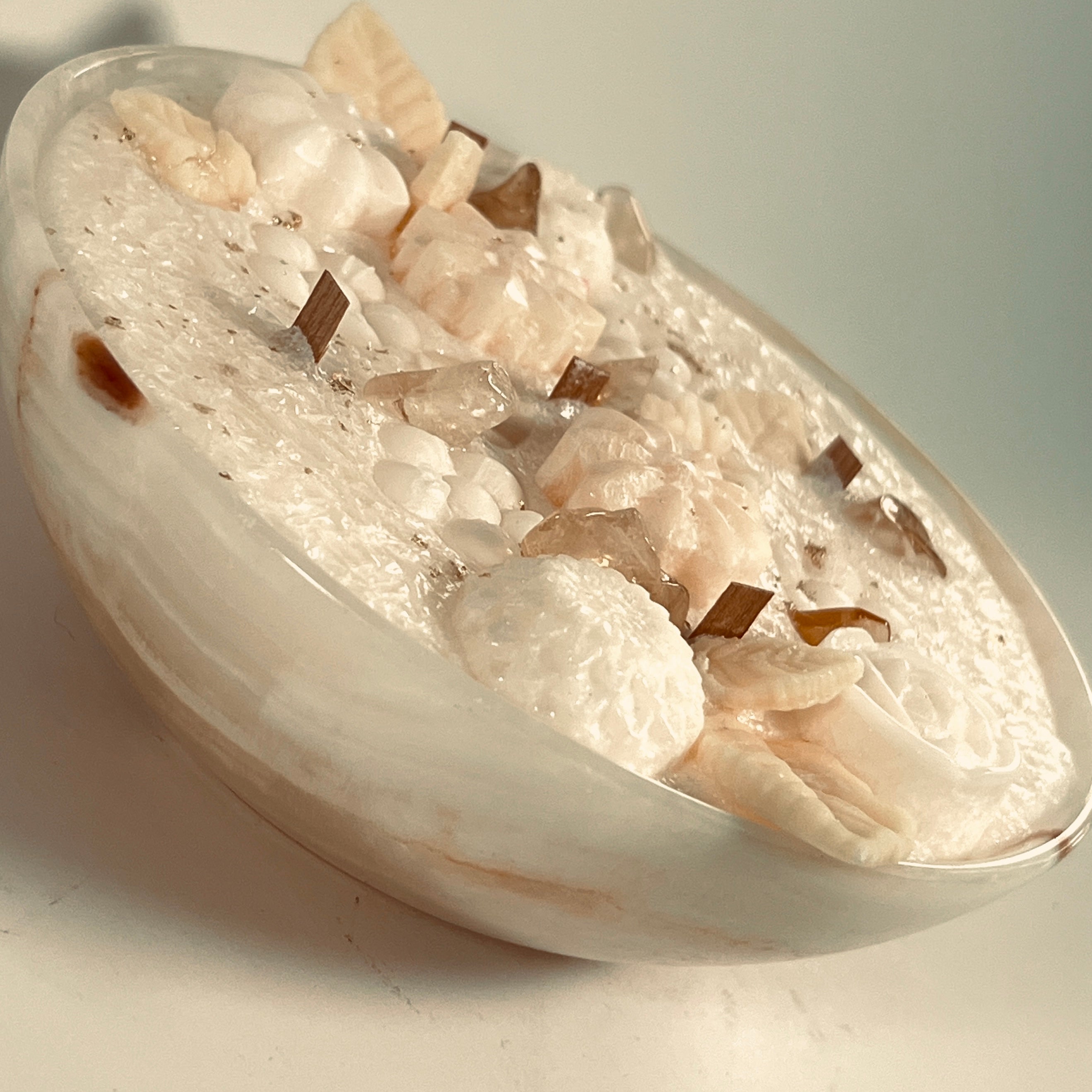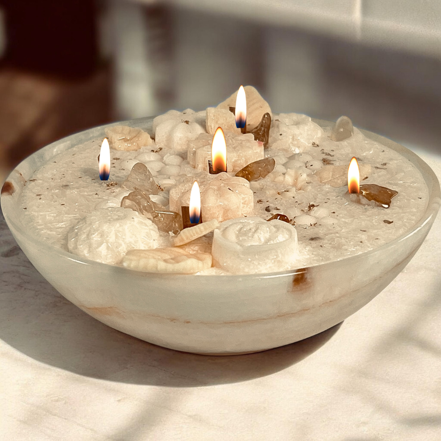 A luminous blend of hand-carved onyx, honey-toned crystals, and sculpted wax—crafted to bring warmth, richness, and quiet serenity into your space.