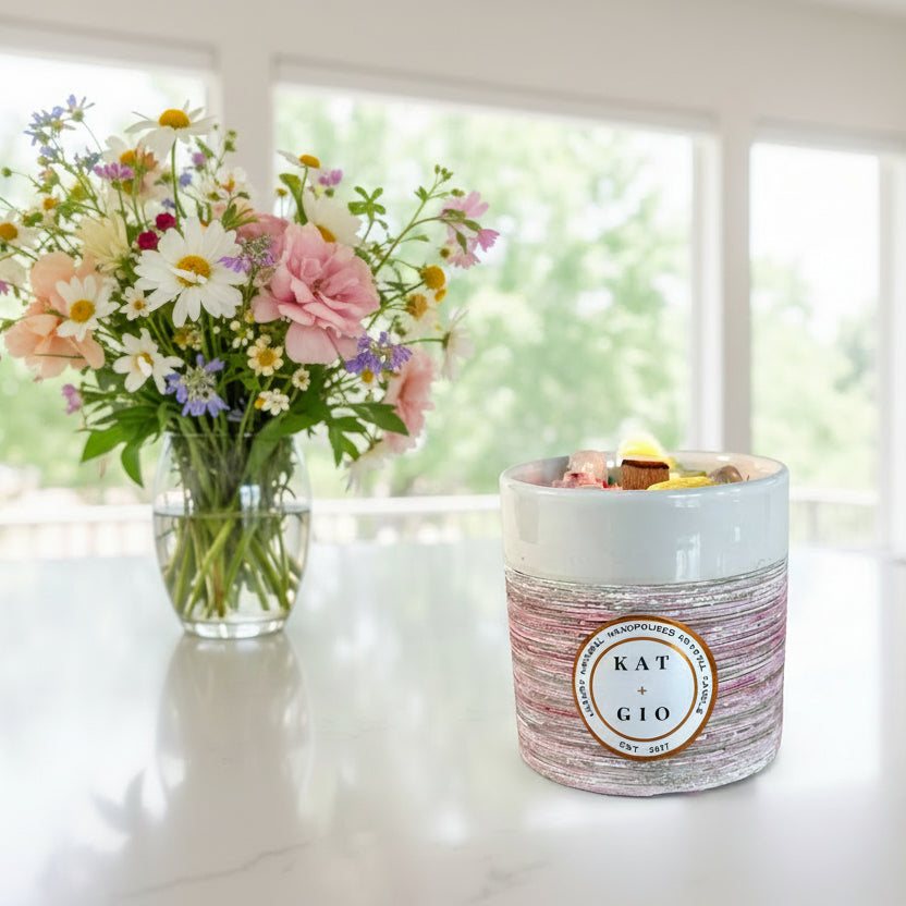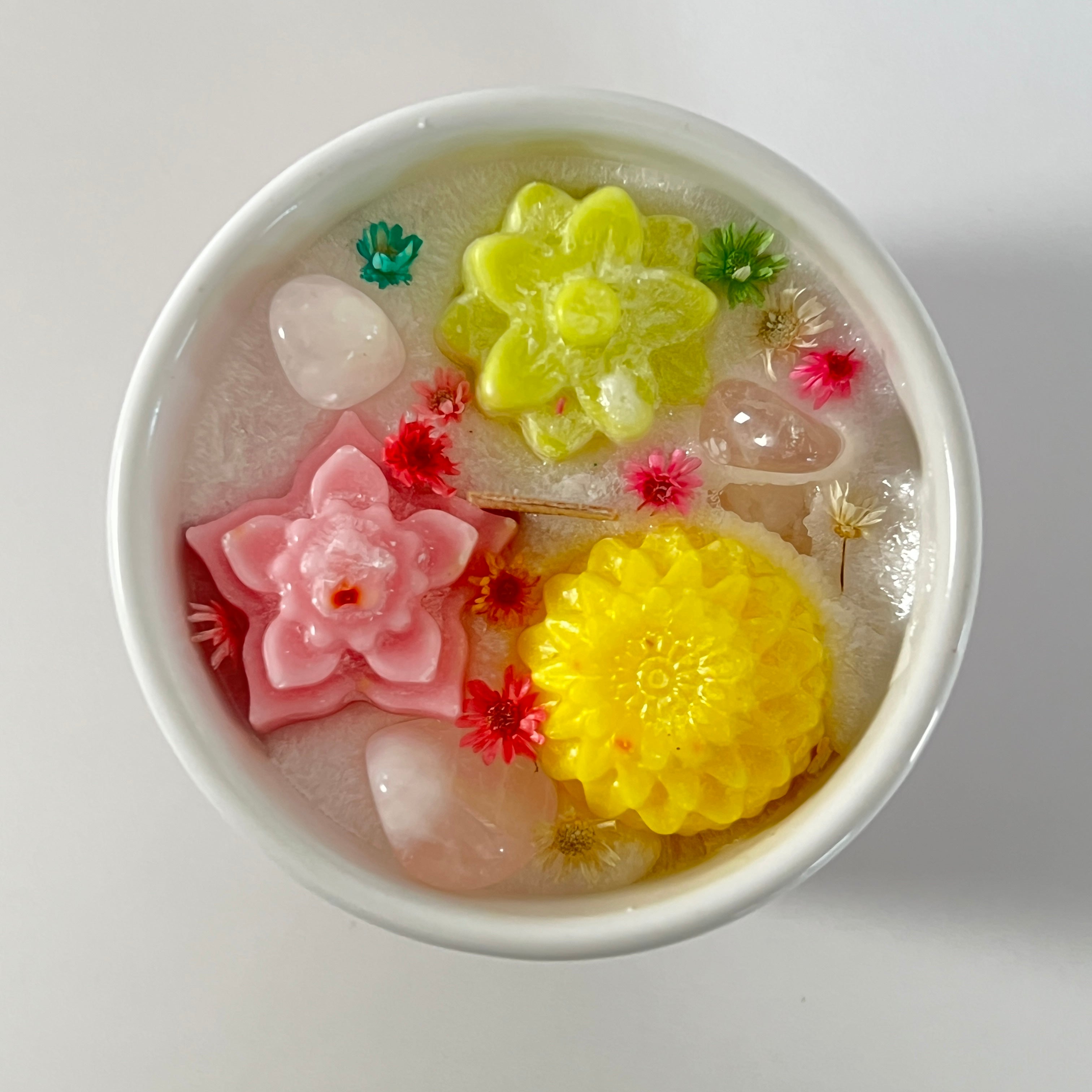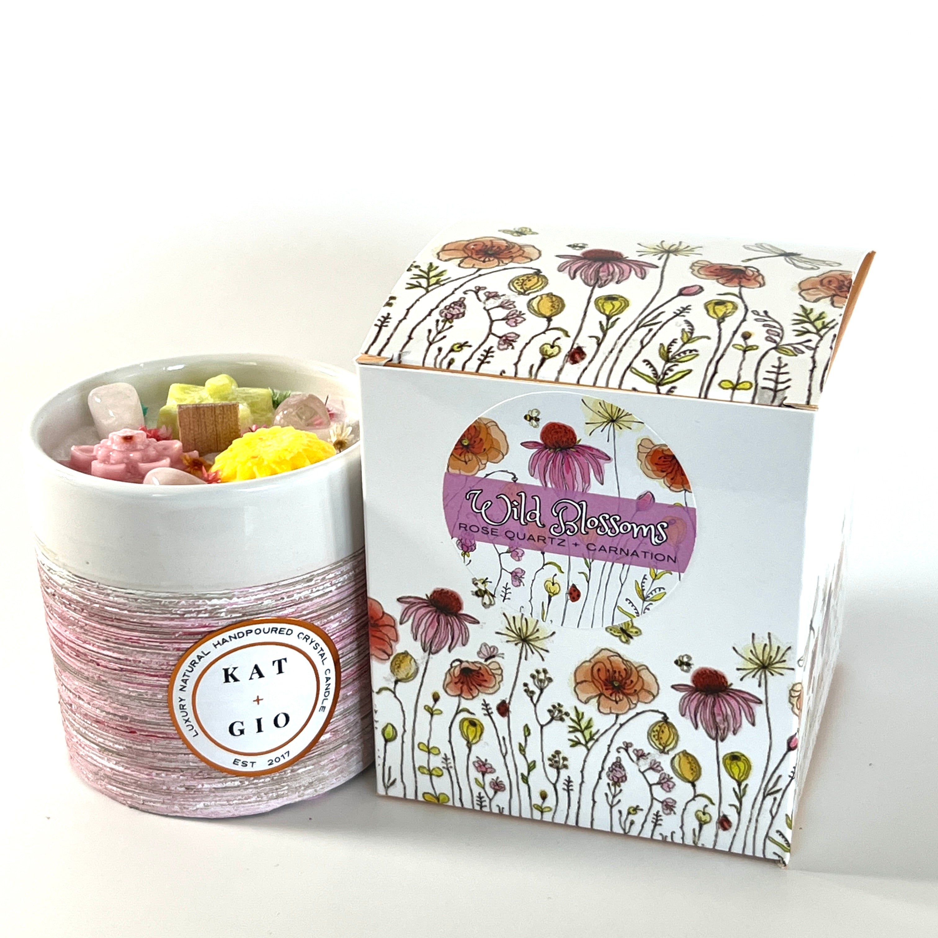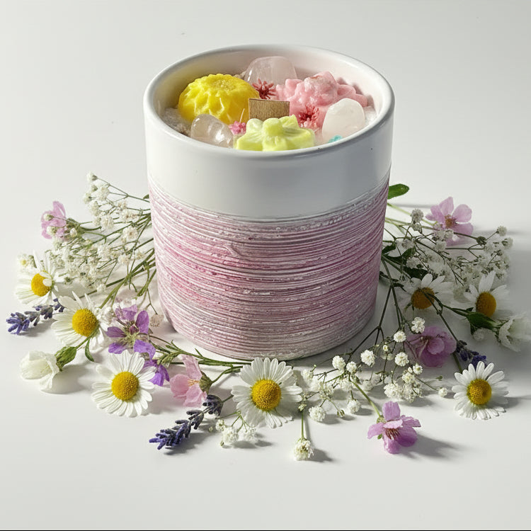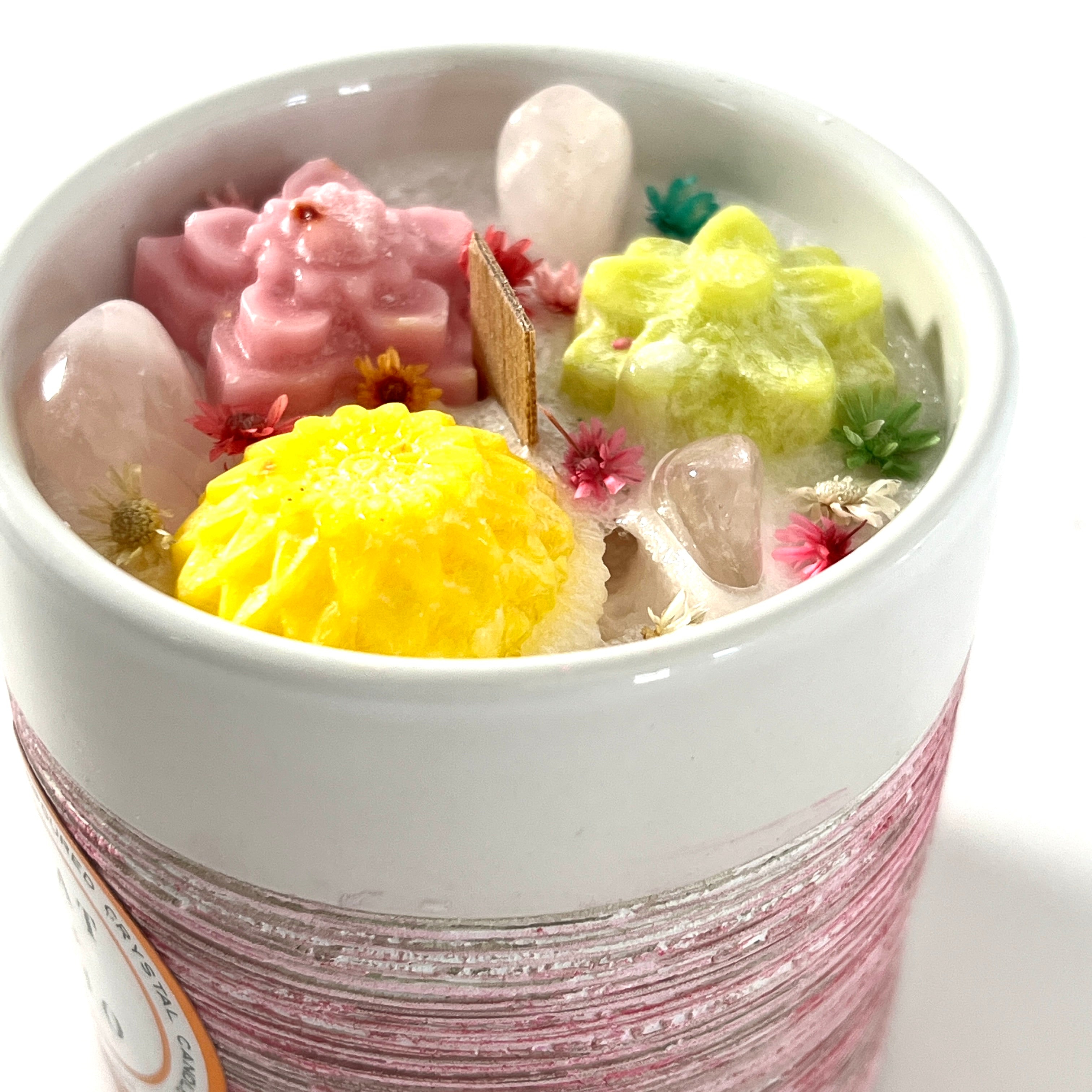 Awaken your heart with our Wild Blossoms Rose Quartz Crystal Candle. Immerse yourself in the tender embrace of rose quartz, the stone of unconditional love, compassion, and emotional healing.